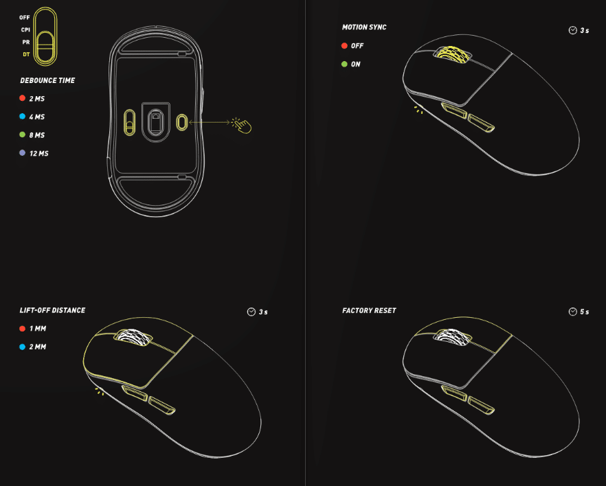Neben der DPI-Einstellung lassen sich der Akkuzustand anzeigen (Linke Maustaste + beide Daumentasten für drei Sekunden halten) und die Polling Rate, Debounce Time, Lift Off Distanz und Motion Sync einstellen, außerdem ist ein Factory Reset möglich. Dies wird simpel in der Anleitung beschrieben und ist schnell gemacht.