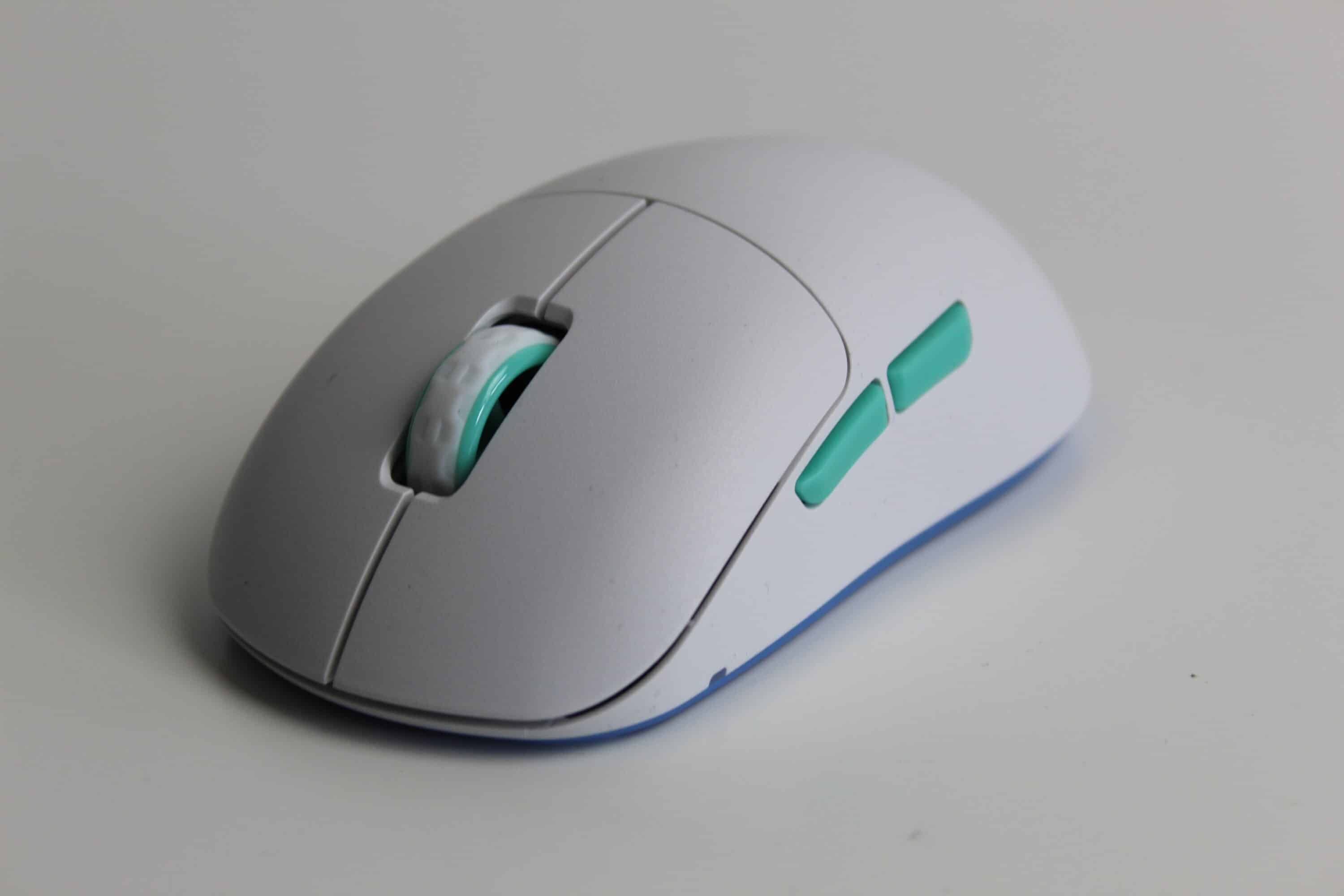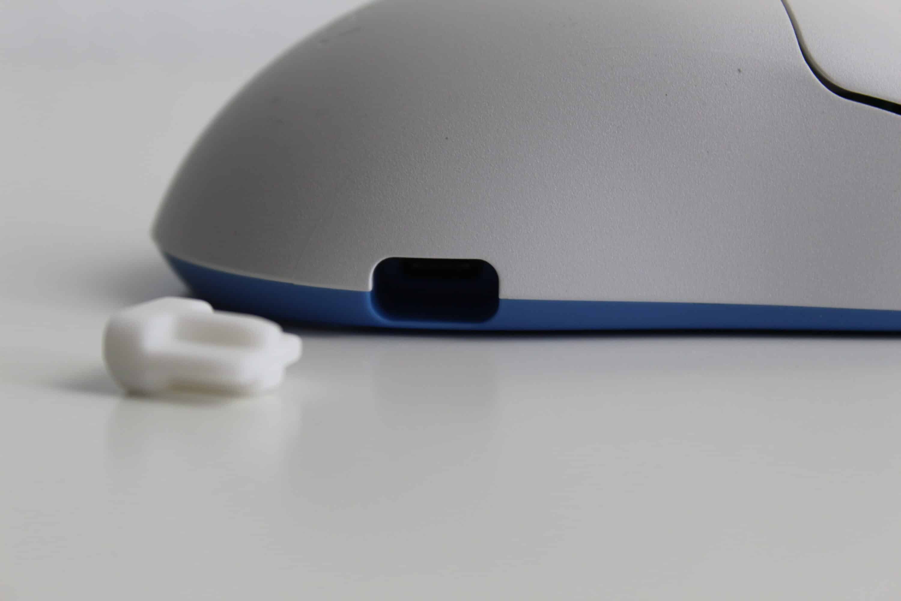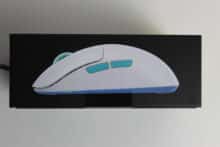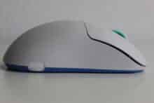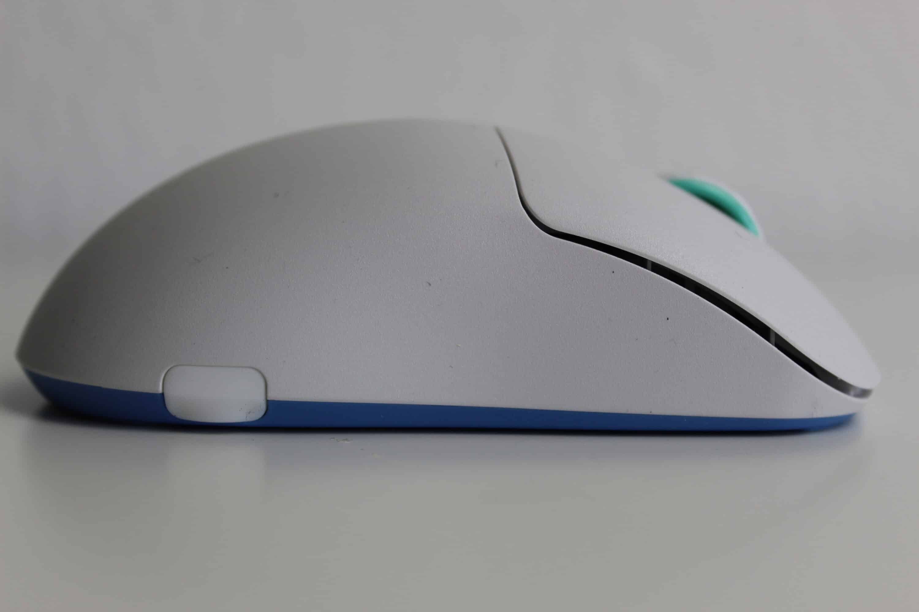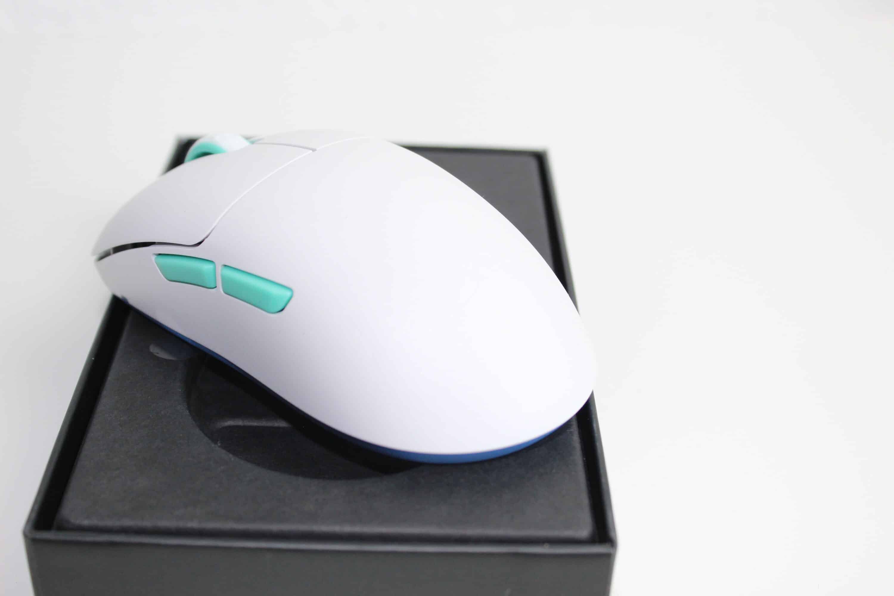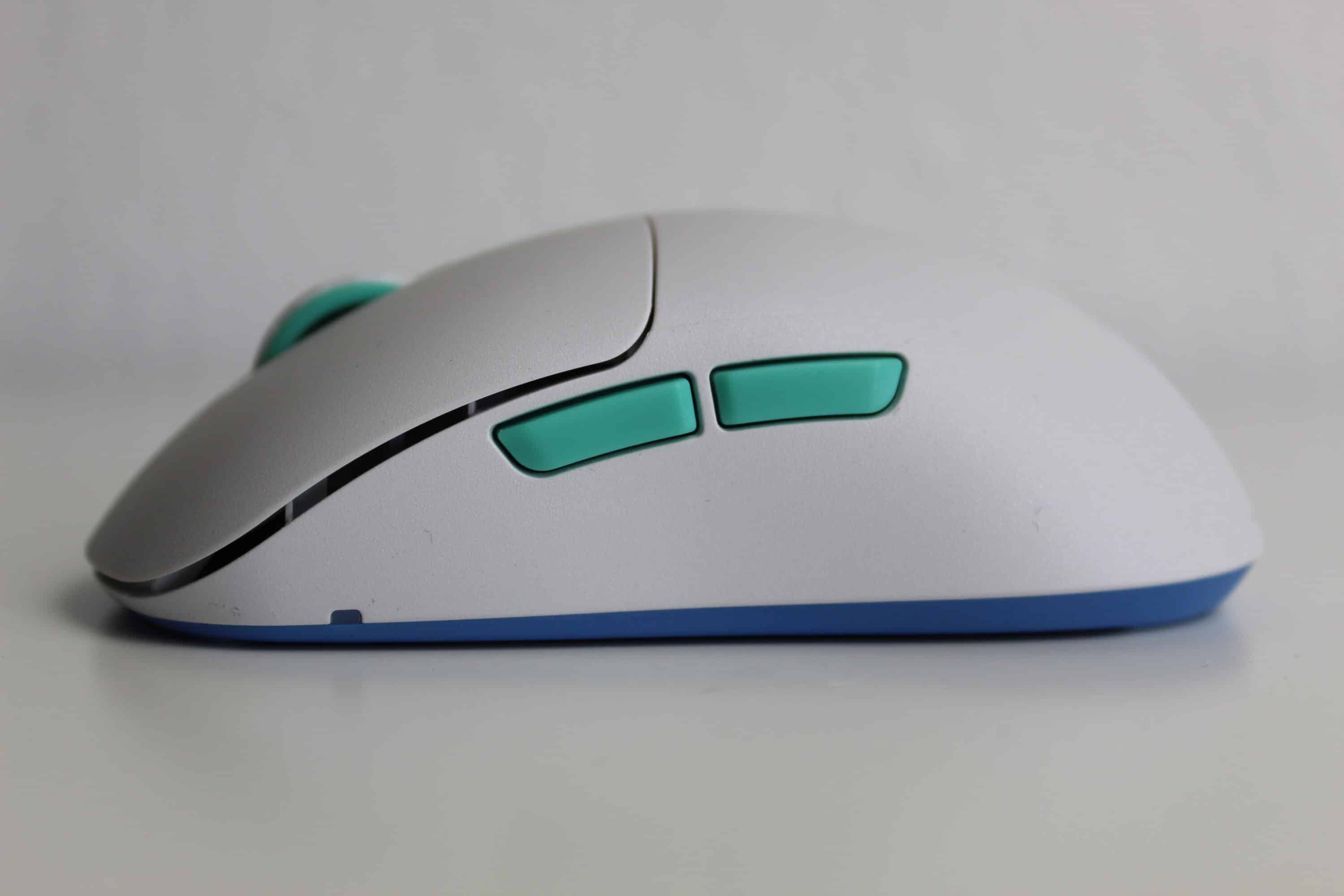 Für unseren Test haben wir die Maus in Weiß mit türkisen Elementen vor uns. Besonders auffällig ist die Form der Maus. Gänzlich ungewöhnlich ist der Ladeanschluss der Maus seitlich hinter einem Gummiverschluss versteckt – dies erlaubt es, dass die beiden Hauptschalter vorne nahezu die Tischkante berühren. Der Abstand von 4 mm zwischen Tisch und Schalter soll die Kontrolle und Genauigkeit verbessern.