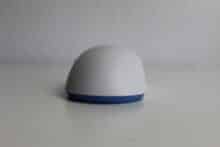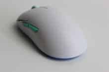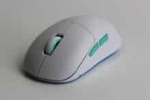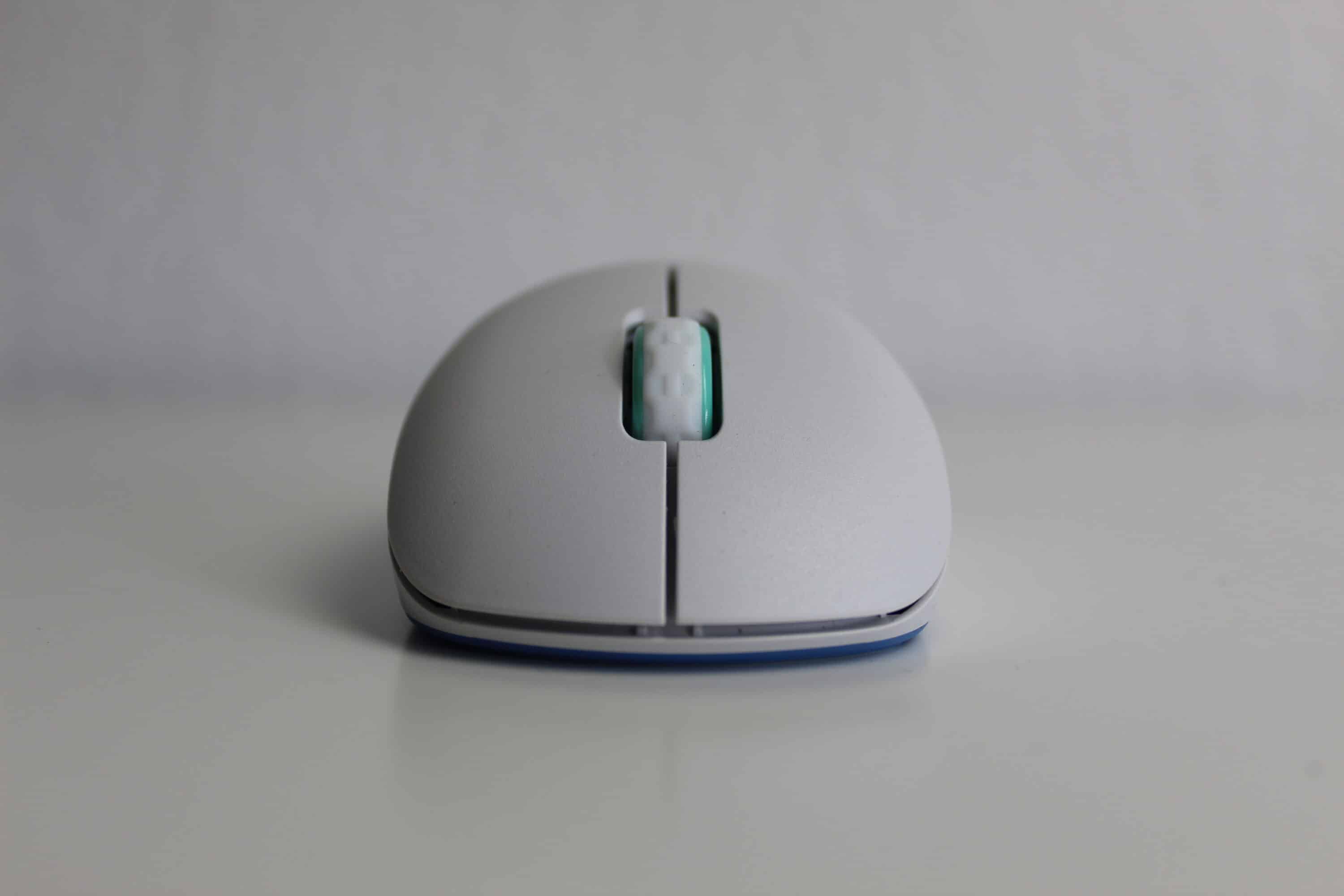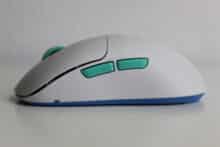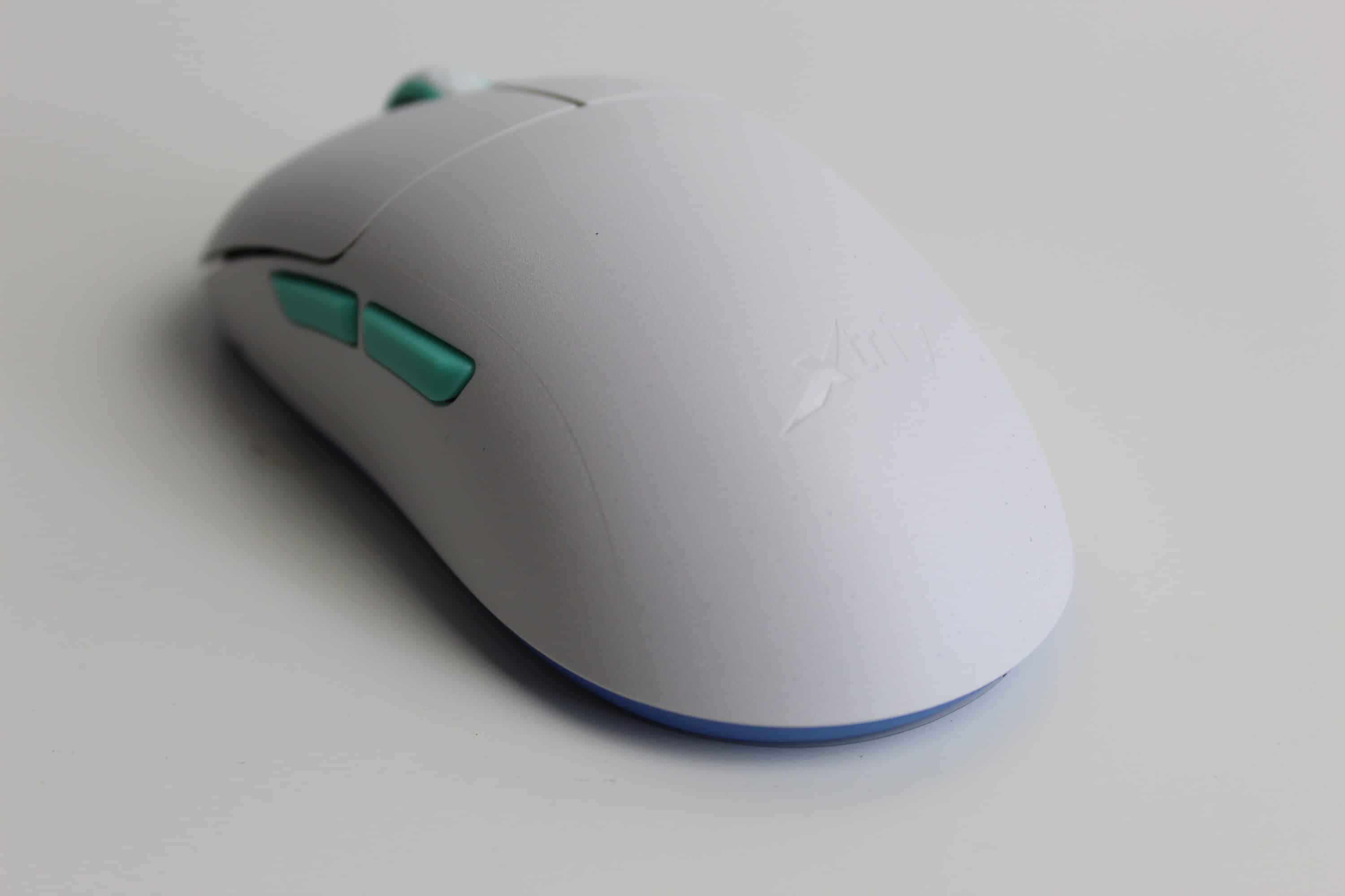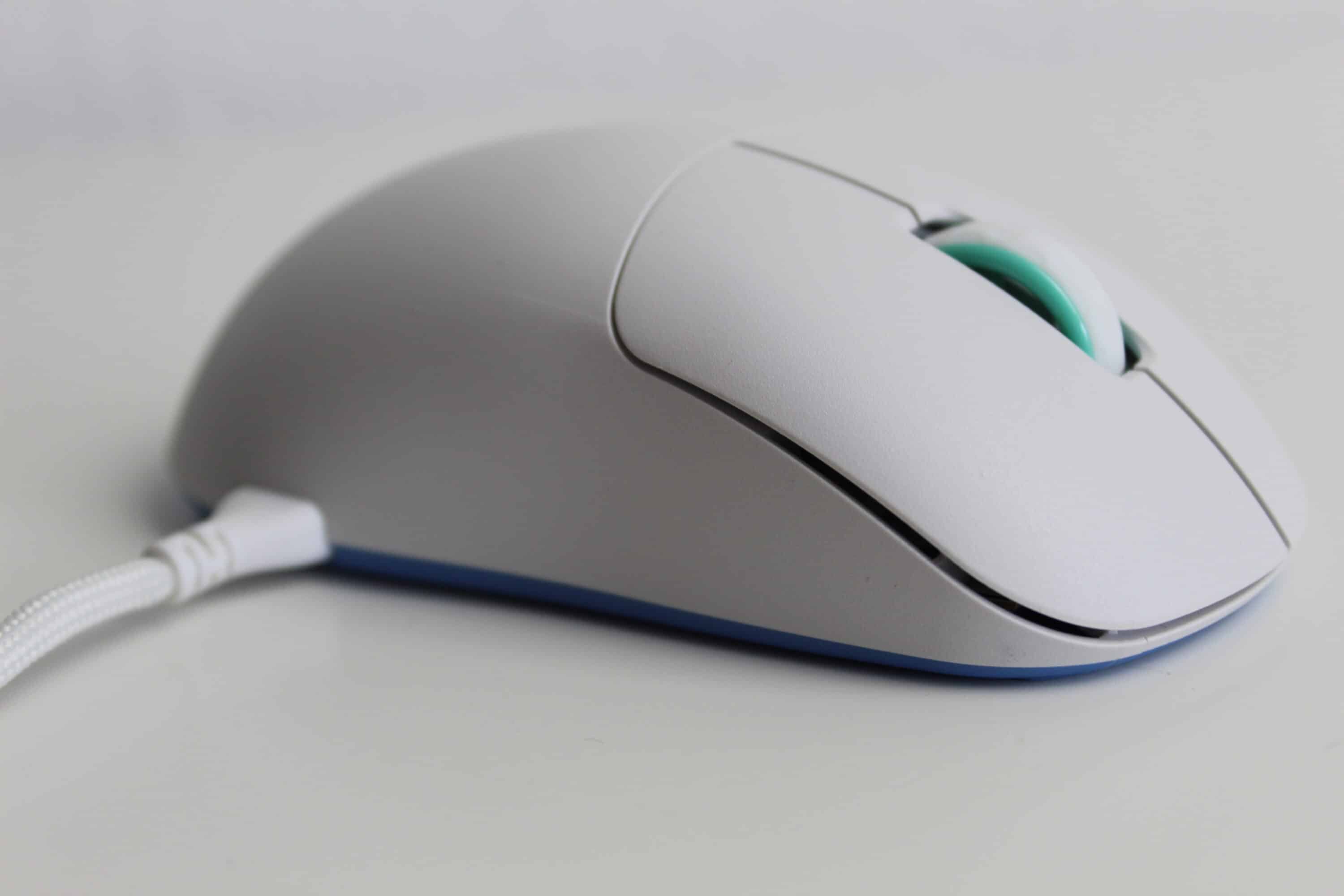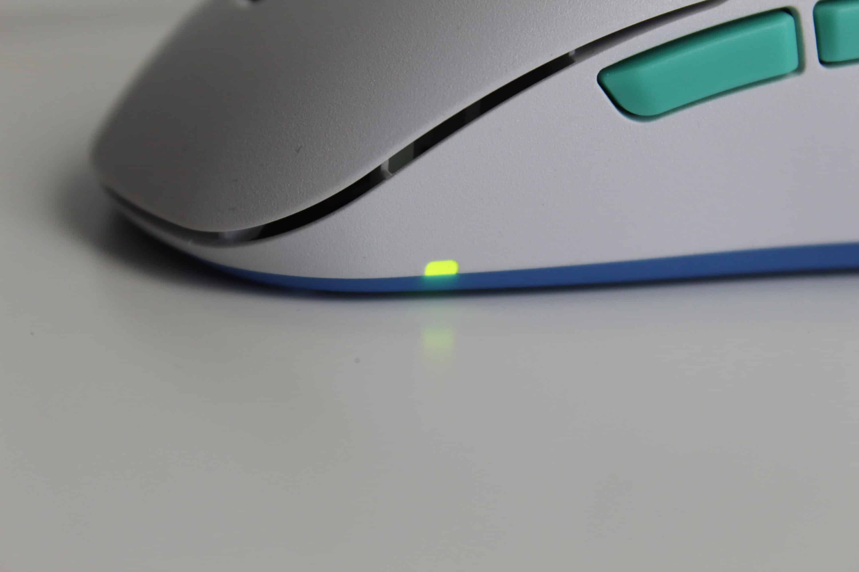 Für unseren Test haben wir die Maus in Weiß mit türkisen Elementen vor uns. Besonders auffällig ist die Form der Maus. Gänzlich ungewöhnlich ist der Ladeanschluss der Maus seitlich hinter einem Gummiverschluss versteckt – dies erlaubt es, dass die beiden Hauptschalter vorne nahezu die Tischkante berühren. Der Abstand von 4 mm zwischen Tisch und Schalter soll die Kontrolle und Genauigkeit verbessern.