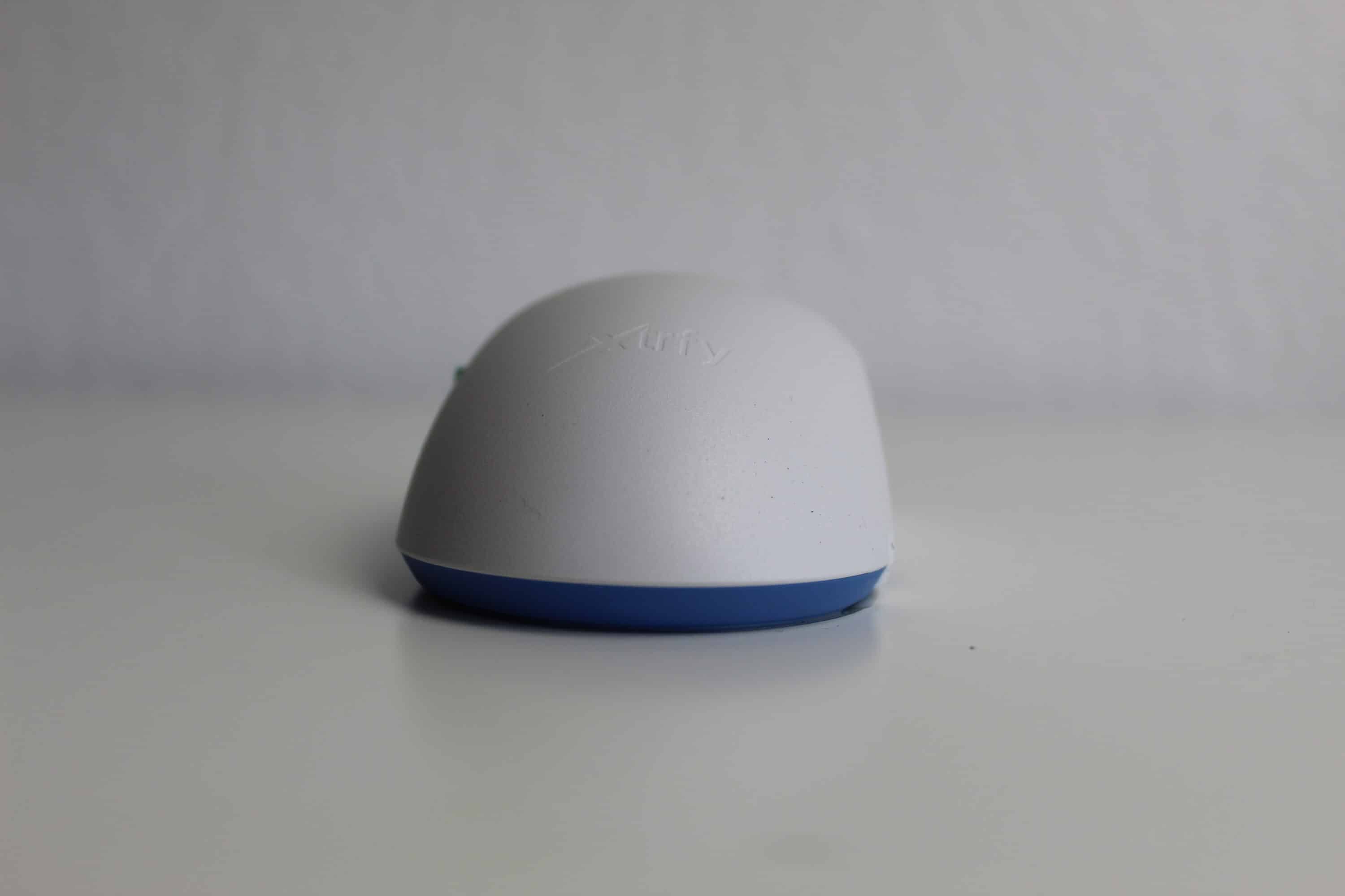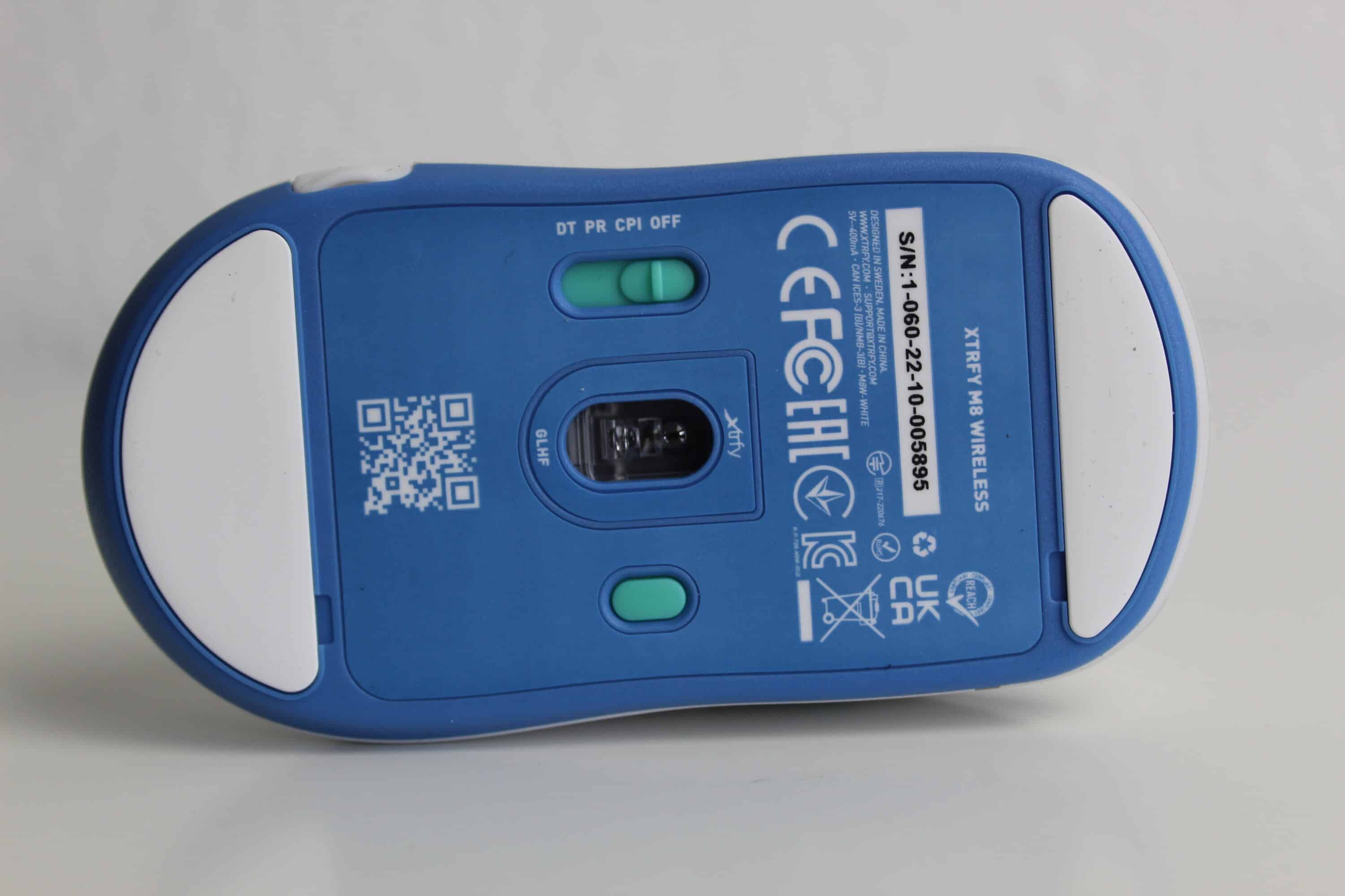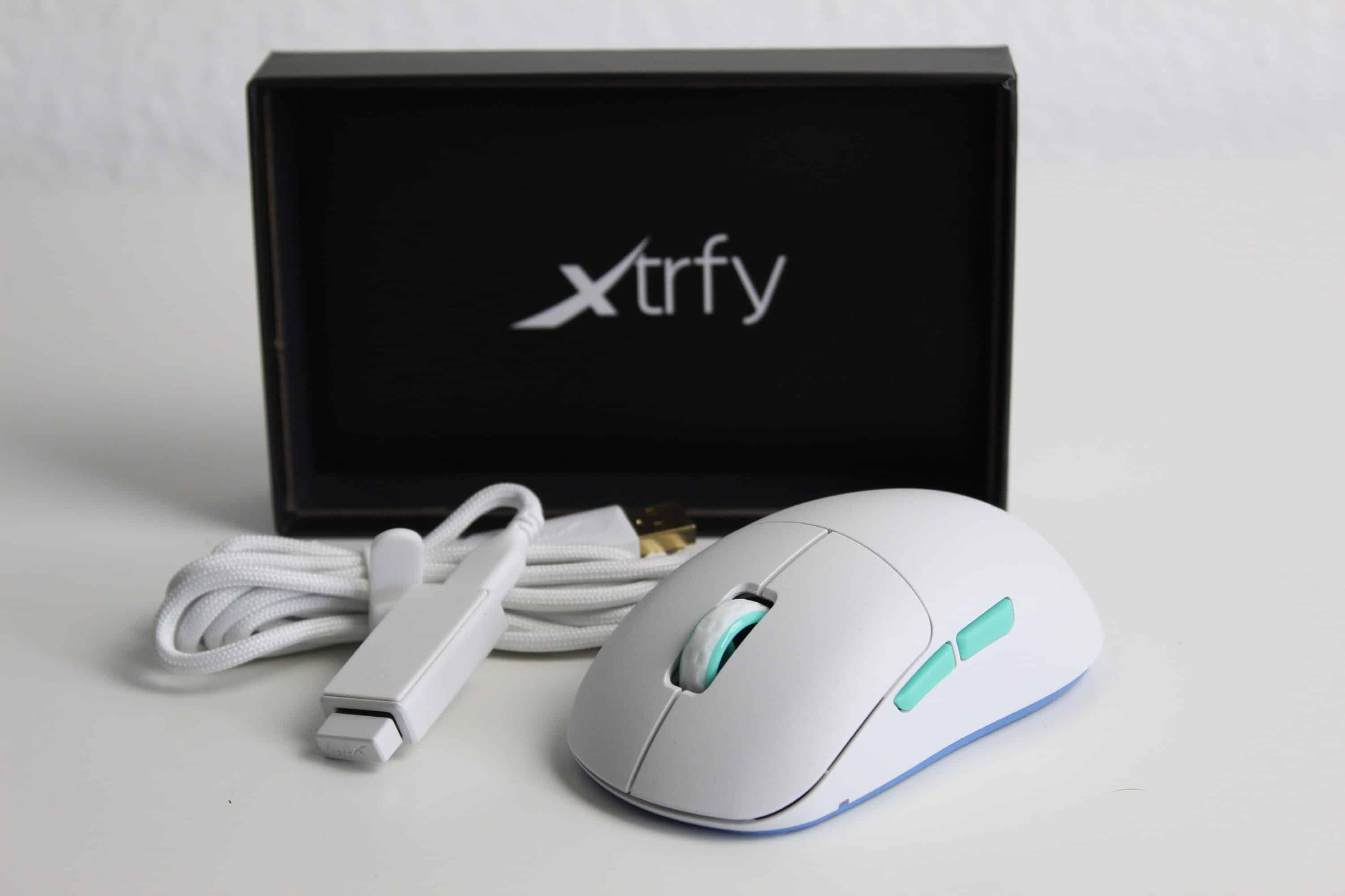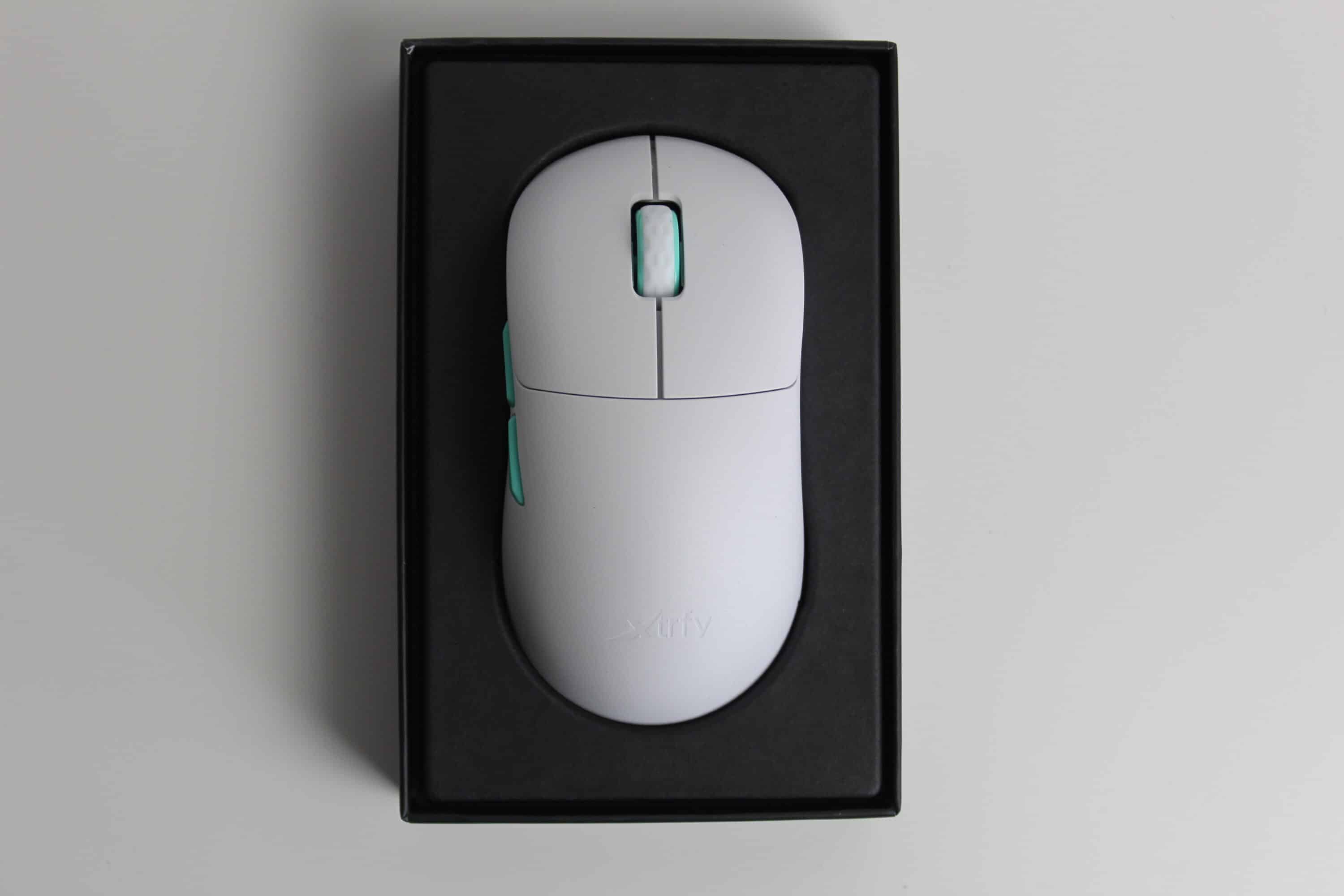 Die verschiedenen Designelemente lassen die Maus hochwertig wirken. So sind sowohl die Daumentasten als auch die Innenseiten des Scrollrades türkis gefärbt, die Unterseite ist gänzlich blau. Auf der Rückseite des Geräts vervollständigt ein elegant eingelassenes Xtrfy-Logo das dezente Erscheinungsbild. Auf der Vorderseite befindet sich unten links eine Status-LED, die den Akkustand und die Konfigurationsmöglichkeiten anzeigt. Dabei wurde bewusst auf zusätzliches RGB-Design verzichtet, um den Fokus auf die Funktionalität zu legen.