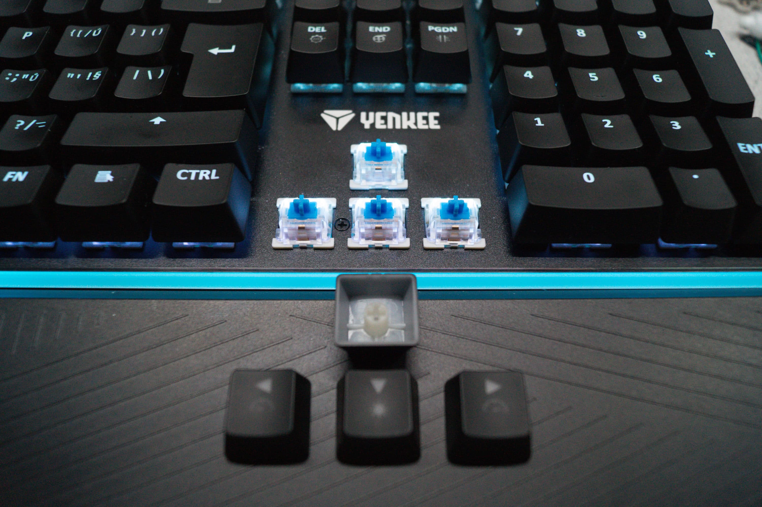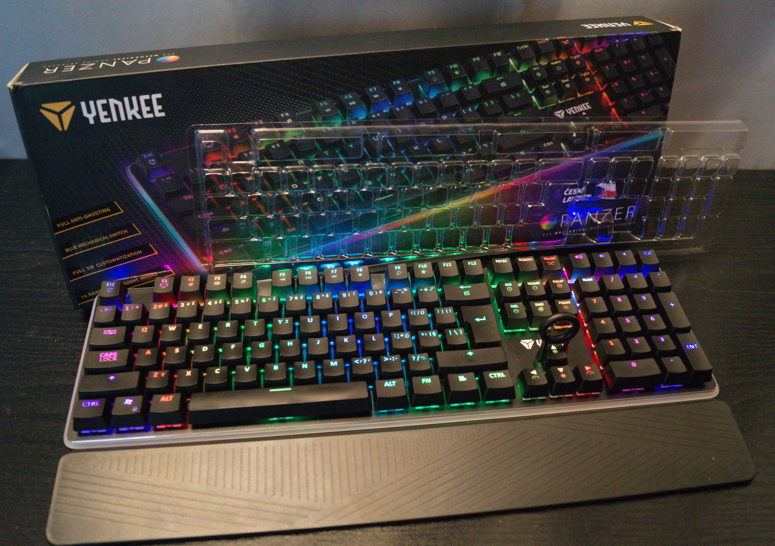 Yenkee, ein noch recht unbekannter tschechischer Hersteller, produziert eine Gaming-Tastatur die nur wenige Wünsche offen lässt. Angefangen mit einer Rainbow-RGB-Beleuchtung, wobei jede Taste mit einer eigenen LED beleuchtet wird, über einen Gaming-Mode, mechanischen Tasten, bis hin zu selbst erstellbaren Marcos, wird dem Gamer hier viel geboten.