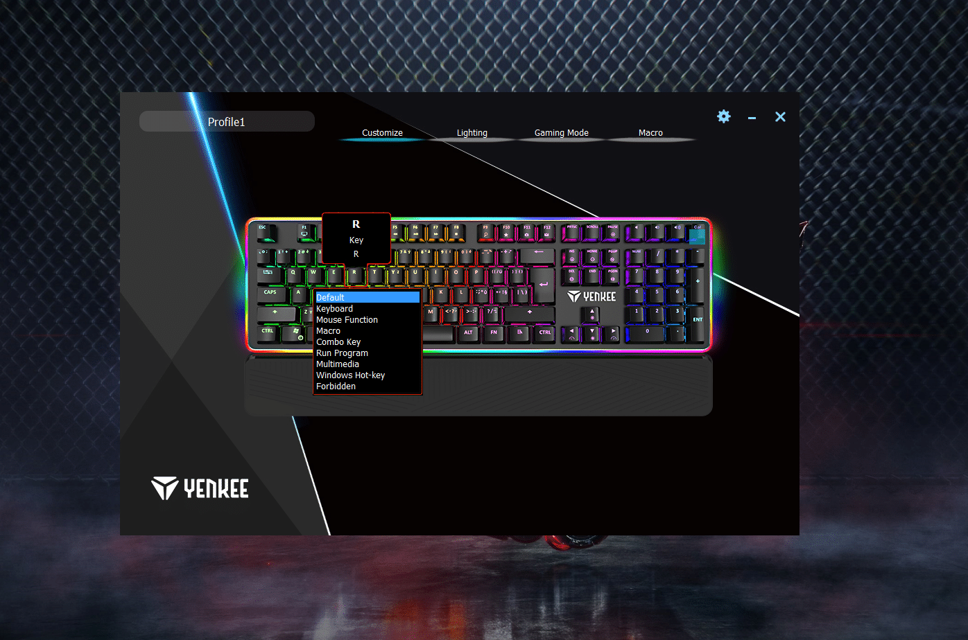 Das Yenkee YKB-3400 Panzer besitzt zwei verschiedene RGB-Bereiche. Zum einen sei hier das Tastenfeld genannt, welches nicht in Leuchtzonen aufgeteilt ist und jede Taste separat mit einer RGB-LED beleuchtet wird. Somit kann jeder Taste eine separate Farbe zugewiesen werden. Zum anderen verfügt die Tastatur über eine Tastenfeldumrandung, welche ebenfalls mit Rainbow-RGB ausgestattet ist.