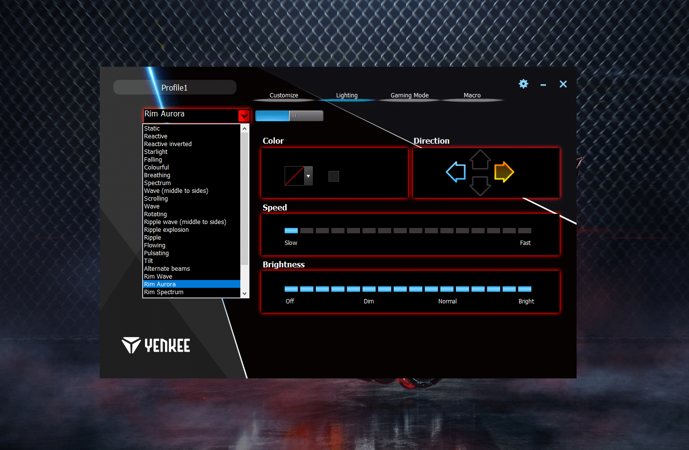 In der Gruppe Lighting können alle RGB-Modi gesteuert und angepasst werden. So ist die Farbe, Laufrichtung, die Geschwindigkeit und die Helligkeit für jeden Mode anpassbar. Alle Konfigurationen können für das Tastenfeld und die Tastenfeldumrandung separat konfiguriert werden.