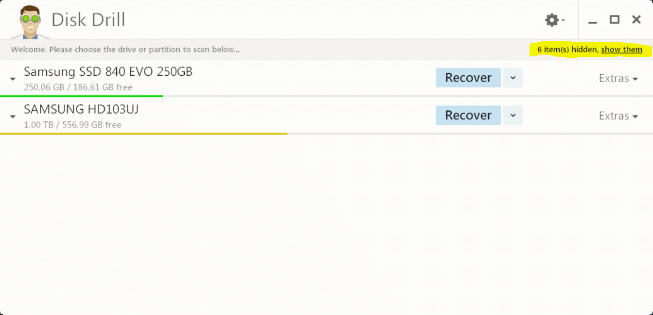 Alle Laufwerke, interne wie externe, gibt die Software beim Starten wieder. Wer nicht auf Anhieb die externen sieht, muss die ausgeblendeten zunächst wieder einblenden. Dazu befindet sich unterhalb der Fenster-Icons eine Verlinkung. Mit einem Klick darauf, werden sie angezeigt.