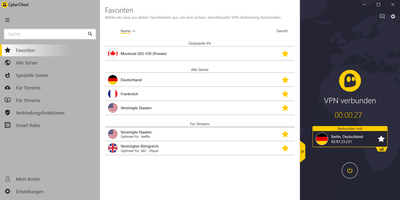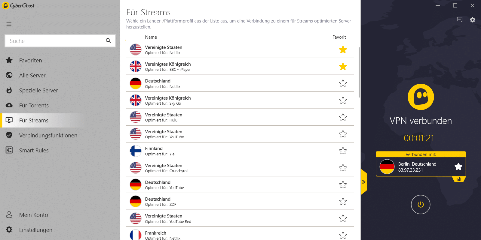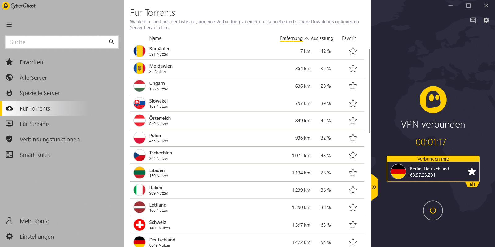 Einen bestimmten Server auszuwählen, fiel uns im Test leicht. CyberGhost bietet eine sehr übersichtliche Liste, in der alle verfügbaren Länder und Server aufgelistet sind. Aus diesem breiten Angebot kann dann ganz einfach per Mausklick gewählt werden.