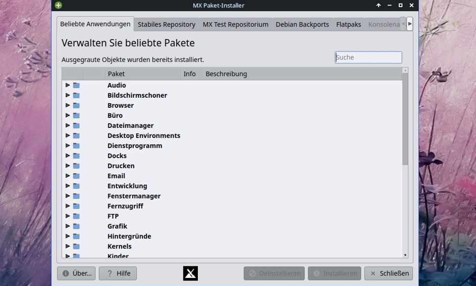 | Paketmanager / -frontends | APT, Synaptic, MX Paket-Installer |
