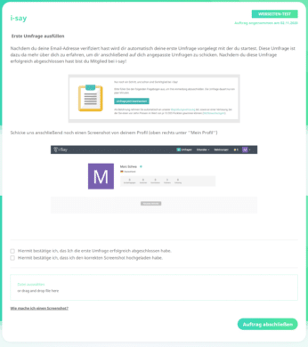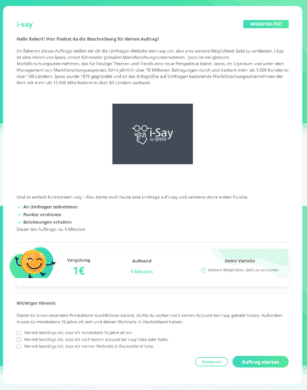 Nach der Bestätigung der Auftragsbedingungen kann der Job direkt gestartet werden. Dazu musste man sich beim i-Say by Ipsos Auftrag beim Portal des Auftraggebers registrieren und seine E-Mail-Adresse bestätigen.