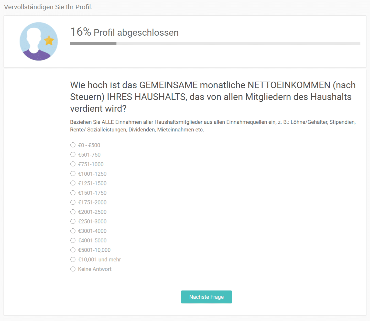 Zur Fertigstellung des Auftrags muss dann noch das Profil bei i-Say vollständig ausgefüllt werden. Dazu ist eine Umfrage nötig, die eine Reihe persönlicher Daten abfragt.