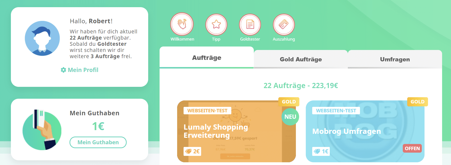 Bei Testerheld.de sind die höher bezahlten Aufträge fast ausschließlich für Goldtester freigeben. Um Goldtester zu werden, müssen aber nur fünf mit dem GOLD Label markierte Aufträge erledigt werden.