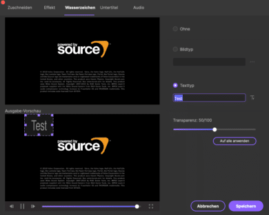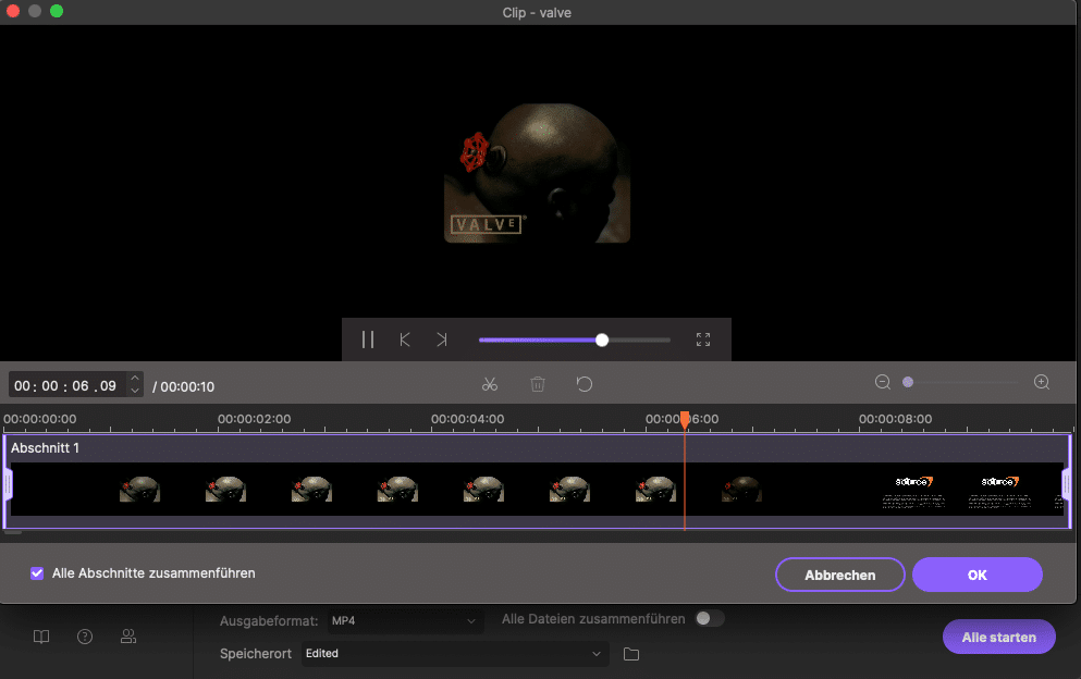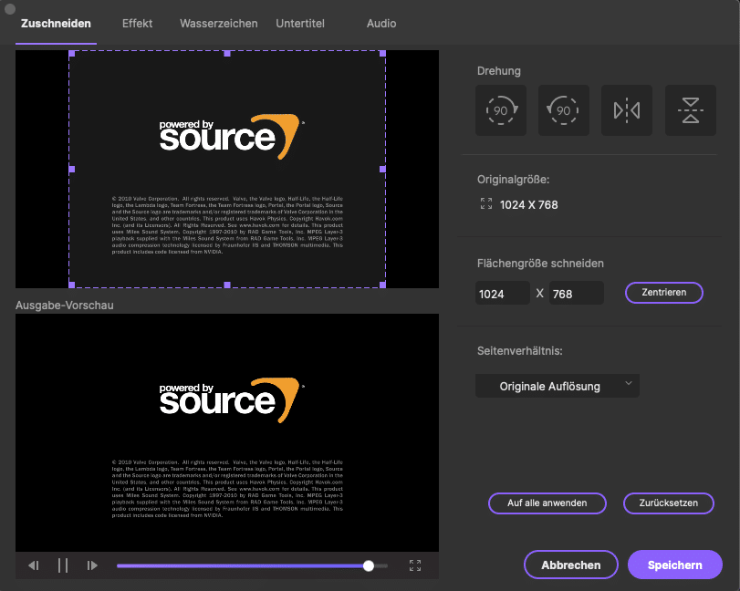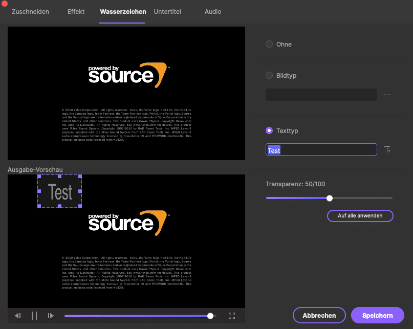 Doch Videos lassen sich mit dem UniConverter nicht nur maßgeschneidert konvertieren. Darüber hinaus kann man sie gezielt bearbeiten. In der Praxis ging dies sehr leicht von der Hand. Ich konnte die Videos nicht nur schneiden, sondern auch Wasserzeichen einarbeiten. Zum Test nahm ich mir das kurze Intro-Video von Valve zur Hand.