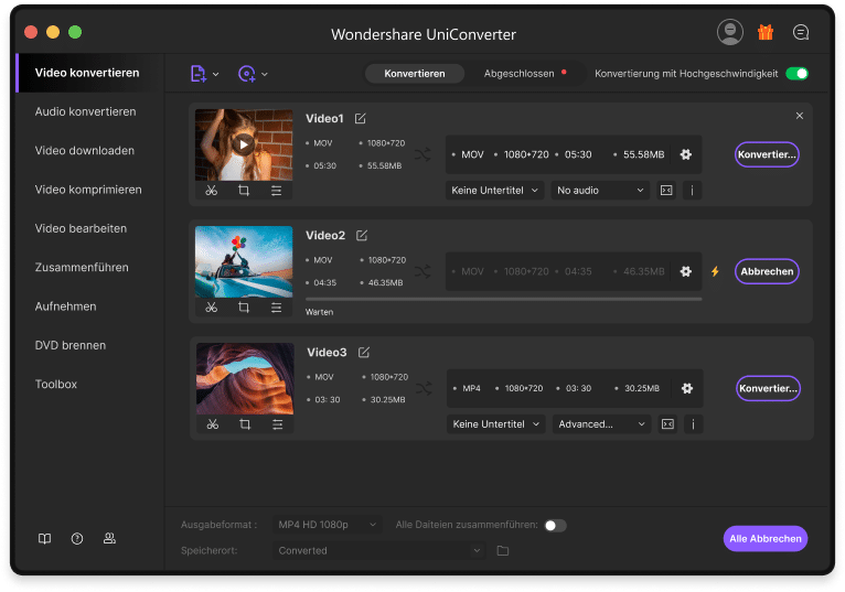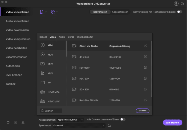Bei meinem iMac spürte ich jedoch keinen wirklich Geschwindigkeitsvorteil. Für einen „normalen“ Konvertierungsprozess (Film im MKV-Format, Full HD, 2:15:00) von iMac auf iPhone X verkleinerte der UniConverter die Datei in ein MP4 Format mit 4,9 GB anstelle von 13,40 GB. Mit eingeschalteter Hochgeschwindigkeit ging der Vorgang nur unwesentlich schneller.