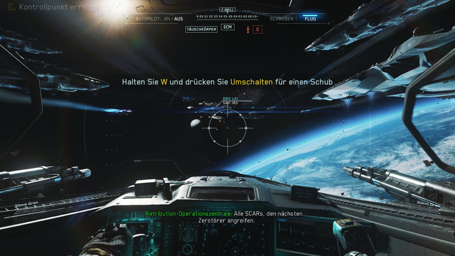 Schon kurz nach der Landung geht der Einsatz schief. Das Team wird von der SDF überrumpelt und vom Oberbösewicht Admiral Salen Krotch (gespielt von Kit Harington, der Serienfans aus „Game of Thrones“ bekannt sein dürfte) kurzerhand hingerichtet. Es folgt ein Schnitt und die Spieler finden sich in der Rolle von Lieutenant Nick Reyes daheim auf der Erde in Genf wieder. Es ist Fleet Week und in der ganzen Stadt findet eine gewaltige Militärparade statt. Was eigentlich ein Grund zum Feiern hätte sein sollen, entwickelt sich schnell zu einer Katastrophe. Denn die SDF hat sich in die Verteidigungsanlagen eingeklinkt, sodass die gewaltigen Kanonen der UNSA auf die eigenen Flugträger schießen, während gegnerische Truppen die Möglichkeit haben, in dem Tumult auf der Erde zu landen. Reyes muss zusammen mit einigen Kollegen fliehen und hebt ins All ab, wo er kurz darauf zum Kommandanten seines eigenen Raumkreuzers befördert wird. Seine Mission ist es von da an, die SDF komplett zu zerschlagen und ihren Anführer Salen Krotch seiner gerechten Strafe zuzuführen.
