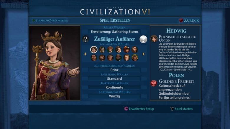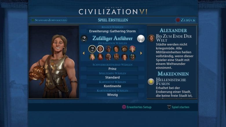 Schon bei der Auswahl des Anführers – von denen es hier ganze 24 an der Zahl gibt – fällt die gute Umsetzung der Schriftgröße auf. Die meisten Texte wurden extra vergrößert, sodass man sie auch vom Sofa aus gut lesen kann. Leider gibt es hier und da noch einige Zusatzfenster oder Abschnitte, in denen die Schrift recht winzig dargestellt wird. Eine manuelle Vergrößerung ist aber nicht drin. Die Steuerung wurde ansonsten sehr gut umgesetzt und sinnvoll auf das Gamepad übertragen. Man kann schnell zwischen den verschiedenen Einheiten, Gebäuden und Technologieschaltflächen Hin- und Herwechseln und sie anwählen.