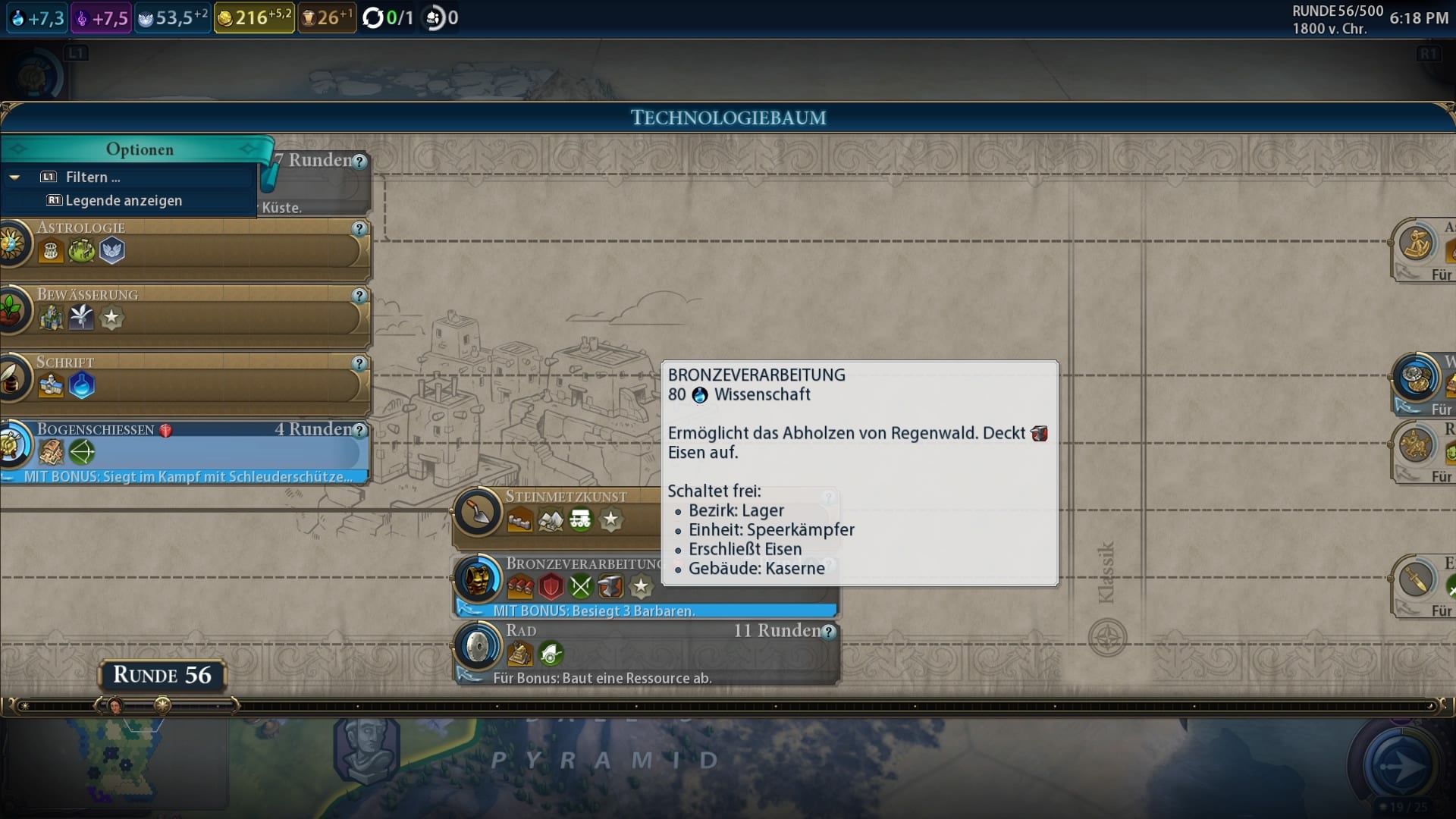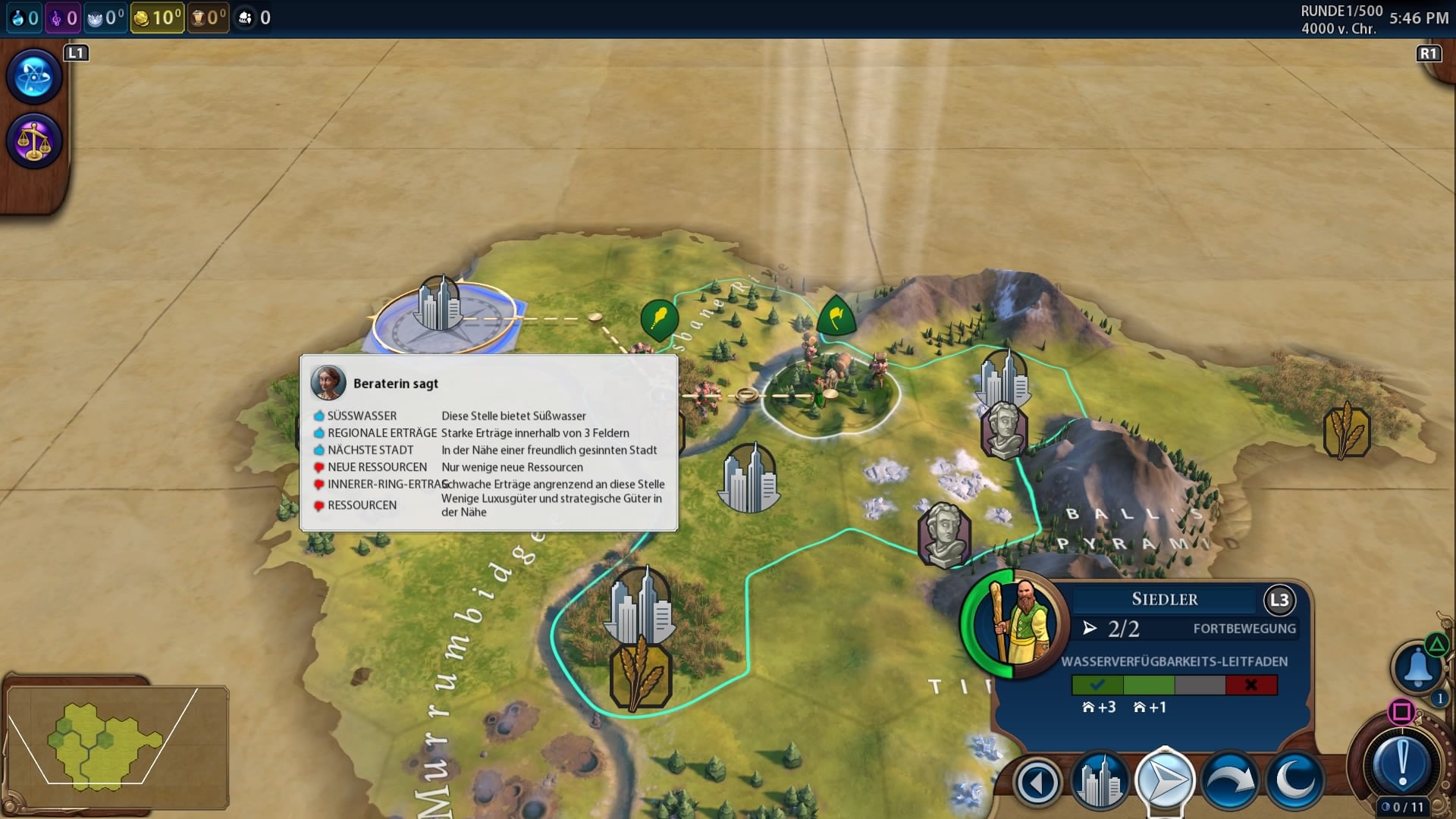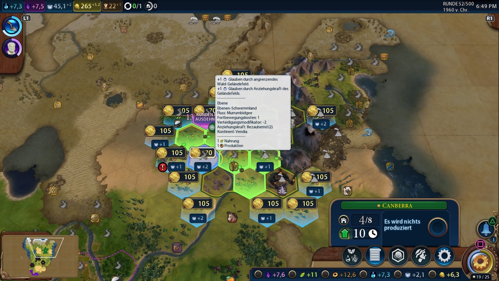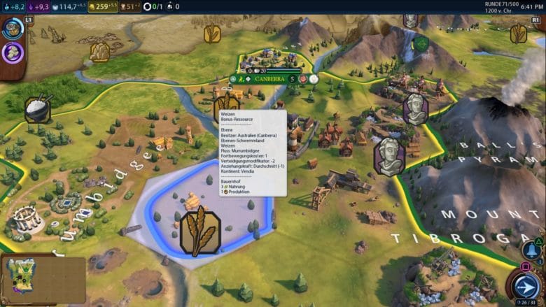 Mit den Schultertasten des Controllers kann man raus- und reinzoomen oder die wichtigen Politik- sowie Diplomatiefenster aufklappen. Mit den Joysticks wählt man Städte aus und bewegt Einheiten, wie gehabt. Mit dem Viereck auf der PS4, beziehungsweise die X-Taste auf der Xbox One, springt man zur nächsten Einheit oder zum nächsten Gebäude. Das Steuerkreuz ist dann für die Sonderfunktionen der Truppen vorbehalten. Man gewöhnt sich schnell an die Konsolensteuerung und dann navigiert man ganz flott hin- und her.