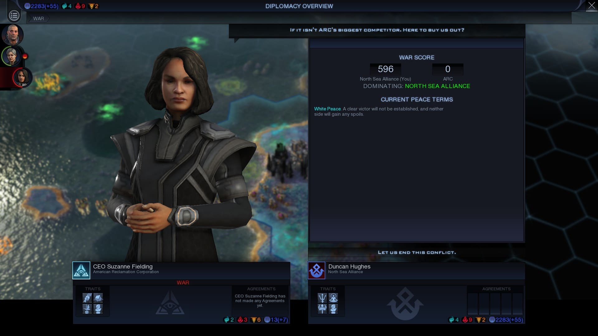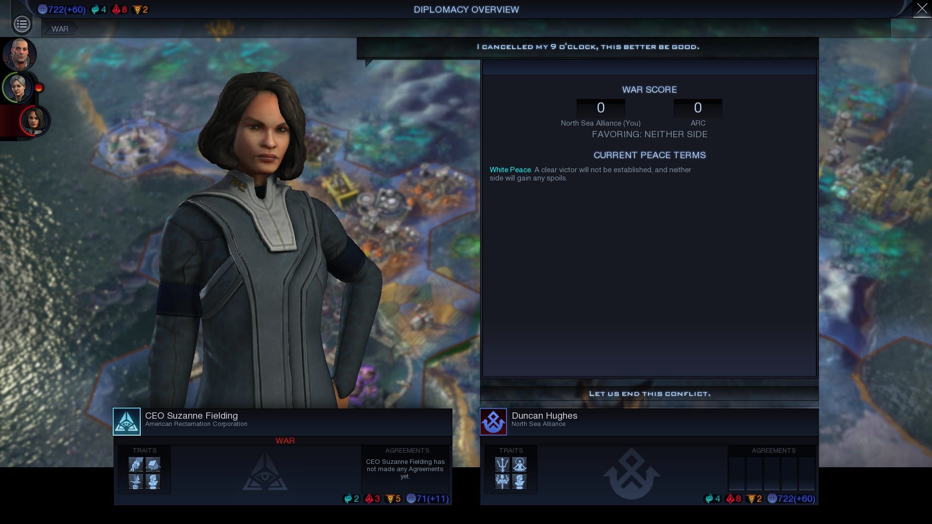 Angeblich lernt man ja aus begangenen Fehlern, doch die KI scheint hier lernresistent zu sein. Schon auf der Erde waren Kriege große Materialschlachten, das hat sich auf unserer neuen Welt nicht verändert. Wieder einmal ist das Besiedeln von Gebieten, die unsere KI für ihr Territorium erklärt, ein Grund zu den Waffen zu greifen. Auch hier gibt es eine Neuheit, wenn wir während eines aktiven Krieges das Diplomatiemenü aufrufen, bekommen wir bei unserem Kriegsgegner eine Übersicht, in Punkten, wie der Krieg läuft. Je nach Upgrades der Truppen oder Gebäude in einer Stadt geben diese mehr oder weniger Punkte. Je deutlicher und größer der Unterschied wird, umso eher können wir hohe Forderungen für den Frieden stellen. Doch Vorsicht: das gilt für beide Seiten. Solltet ihr in einem Krieg unterlegen sein, wird euch ein Friedensabkommen auch viel kosten.