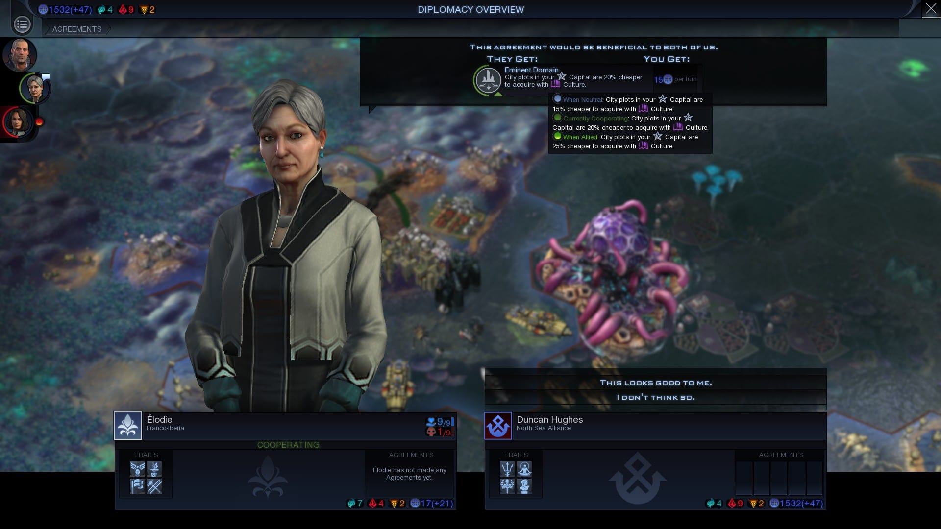 Neben den Abkommen gibt es auch persönliche Eigenschaften, diese werden wie die Abkommen durch diplomatisches Kapital bezahlt, welches ihr durch verschiedene Gebäude und Wunder erhaltet. Während die Abkommen von beiden Seiten ründlich bezahlt werden und auch beide die Belohnung erhalten, sind die persönlichen Eigenschaften kaufbar und dann gegen einmalige Bezahlung bis auf Stufe 3 aufwertbar. Solltet ihr später eine andere Eigenschaft bevorzugen, könnt ihr diese, gegen einen kleinen Preis, austauschen.