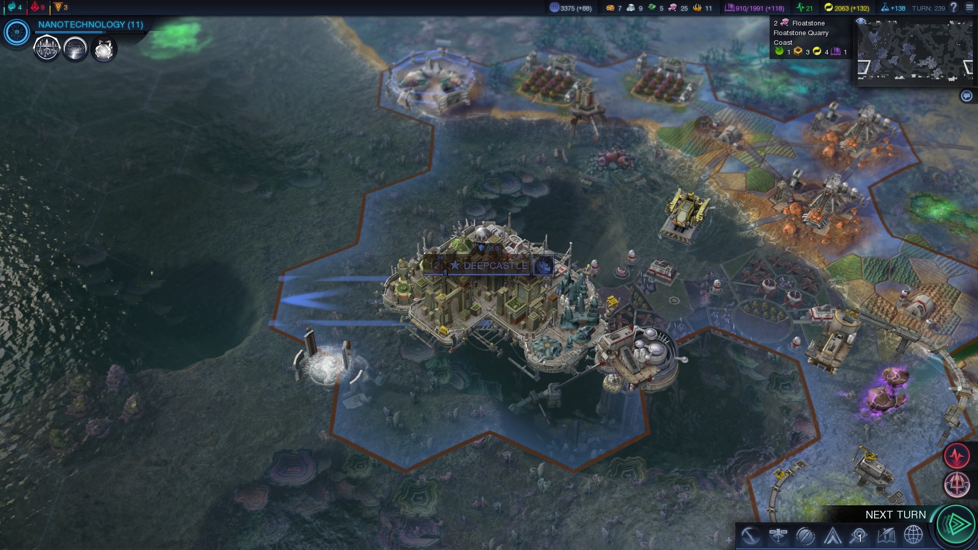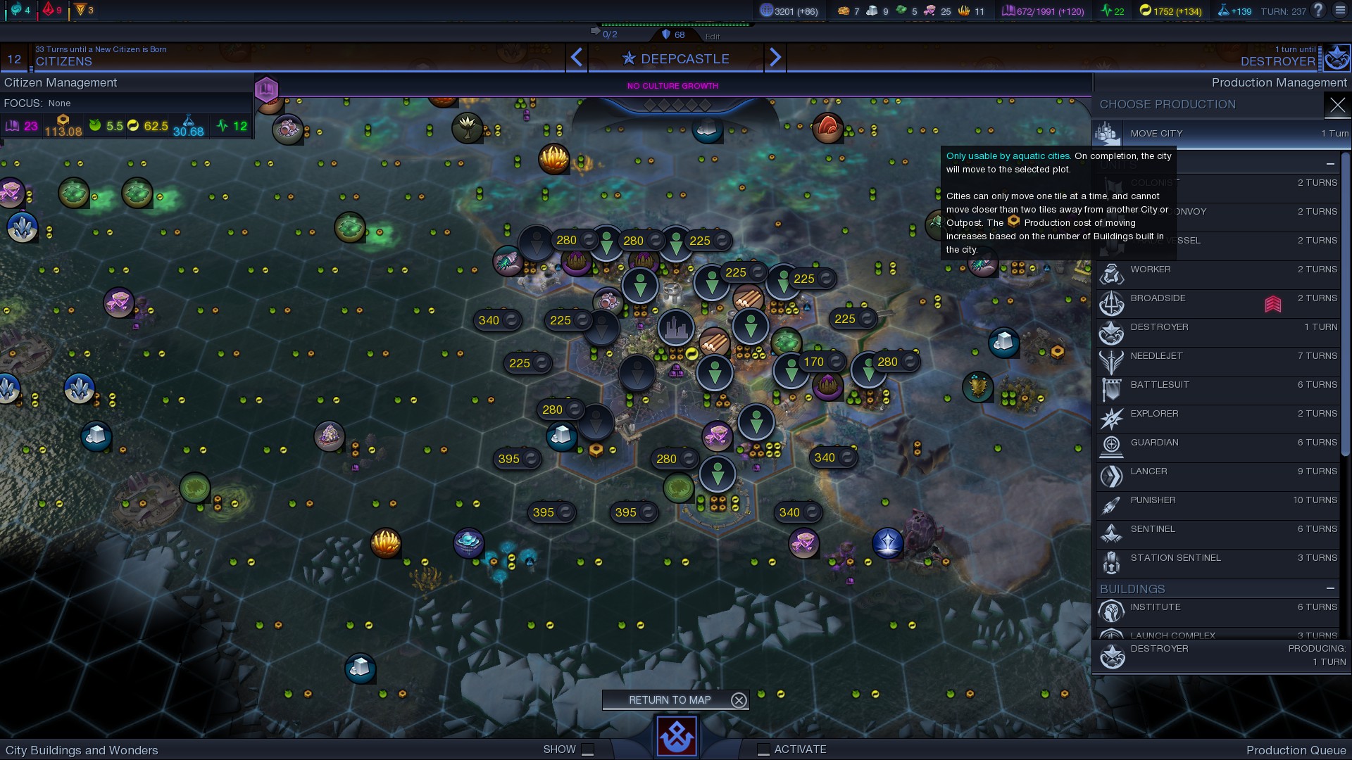 Doch wozu gibt es eigentlich die bereits angesprochenen neuen Schiffe? Da wir nun auch Städte im Meer ansiedeln können brauchen wir dort auch eine stärkere militärische Präsenz. Nach meiner Erfahrung neigen die Meeresbewohner, im Vergleich zu ihren Artgenossen an Land, schneller dazu unsere Geländeverbesserungen zu zerstören oder auch Städte anzugreifen. Die Städte zu Wasser verhalten sich allerdings anders als jene zu Land. Das Einflussgebiet der Stadt wächst nicht automatisch, ihr müsst das Gebiet hinzu kaufen oder durch das Bewegen der Stadt vergrößern. Ja richtig, wir können unsere Städte nun bewegen. Zu Anfang dauert es noch lange 17 oder mehr Runden um 1 Feld zu wechseln, dies wird aber später durch Forschungen und Gebäude durchaus schneller. So ist es möglich eine Stadt zu bewegen und als Brückenkopf für eine Offensive zu benutzen.
