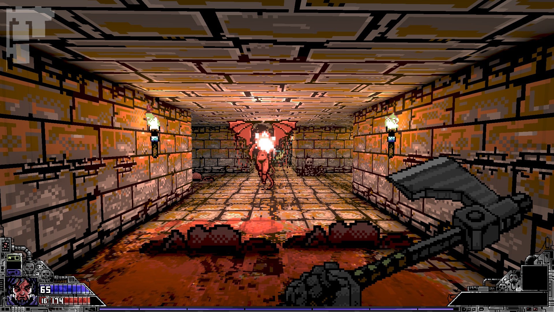 Project Warlock ist eine Hommage an die klassischen First-Person-Shooter der 90er Jahre. Das bedeutet die Sprites sind flach und die Pixel groß. Dazu ist die Beleuchtung stimmig und lässt die Level noch ein wenig schicker wirken. Ähnlich sieht es bei den einzelnen Effekten aus, ob Feuer, Explosion oder das Platzen von Gegnern, es sieht einfach immer gut aus. Nur an einigen Stellen wirken die Level etwas zu dunkel.