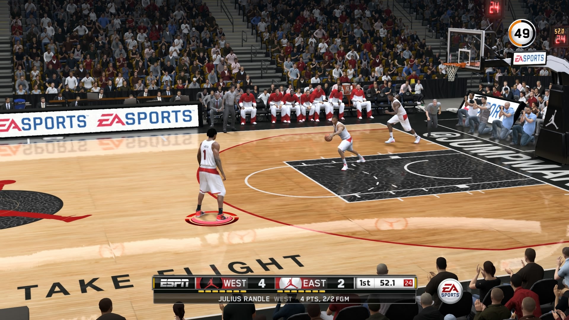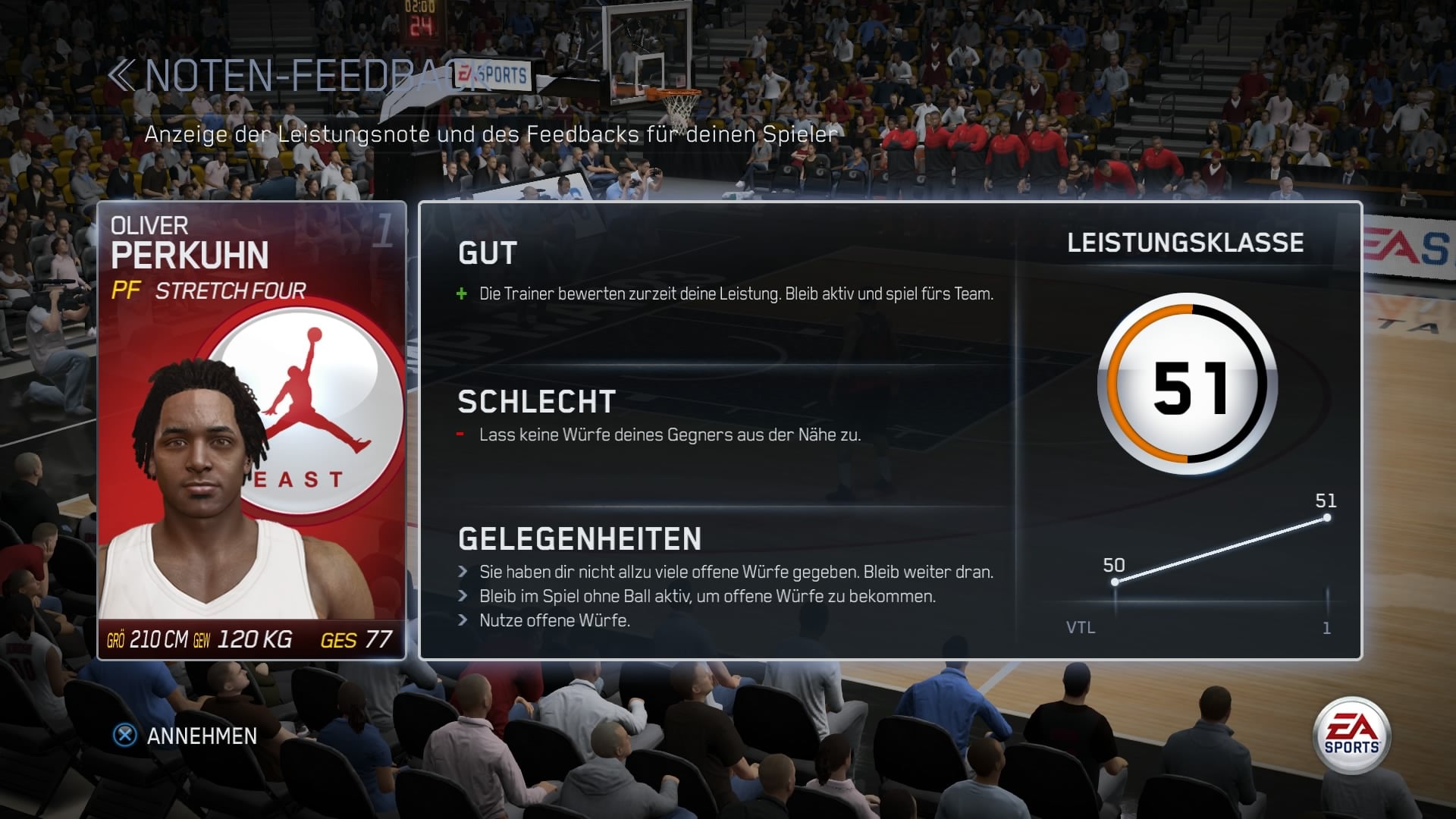 In der Offensive kann man schnell in die gegnerische Hälfte laufen und hier den Ball an Mitspieler abgeben, jedoch muss man, wenn man den Ball auf den Korb werfen möchte, schnell sein, da man sonst nicht den perfekten Abwurf Zeitpunkt trifft. Dieser ist meiner Meinung nach zu früh gesetzt und der Spieler muss dadurch einfach hetzen. Hier kann EA auch weiterhin noch Dinge verbessern.