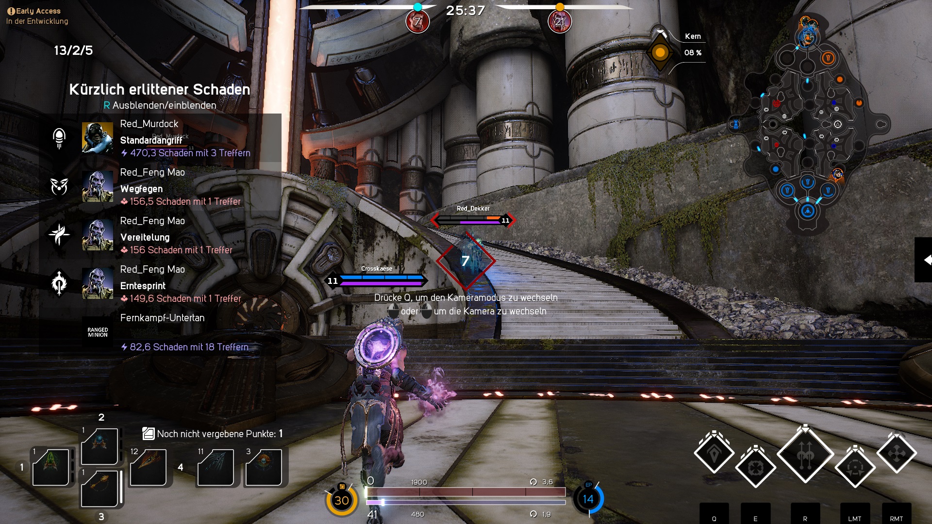 Wie bei anderen MOBAs gibt es im Jungle Camps, die euch unterschiedliche Buffs geben. Es gibt einen Red Buff, der euren Angriffsschaden erhöht, einen Blue Buff, der eure Manaregeneration erhöht und die Abklingzeiten von Fähigkeiten verringert, ein Basic Camp, welches euch EP und KEP einbringt, einen Black Buff, der euch erhöhten strukturierten Schaden und Angriffstempo gibt und zu guter letzt gibt es noch den Purple Buff, den Ihr nur mit eurem Team bezwingen könnt. Der Purple Buff aktiviert in eurem Team die „Prime Helix Karten“ und bufft eure Vasallen, die nun mehr Leben und Schaden haben.