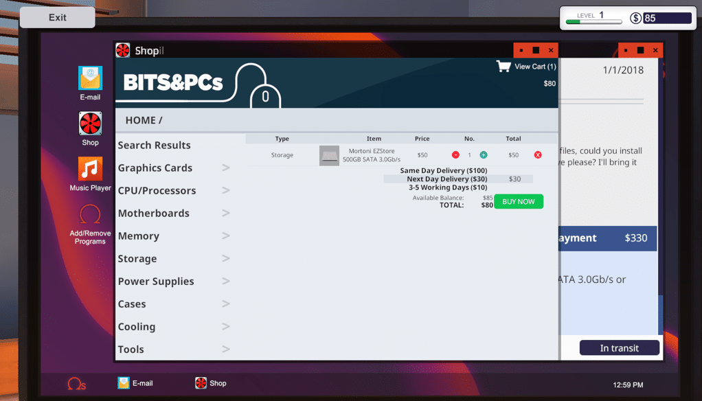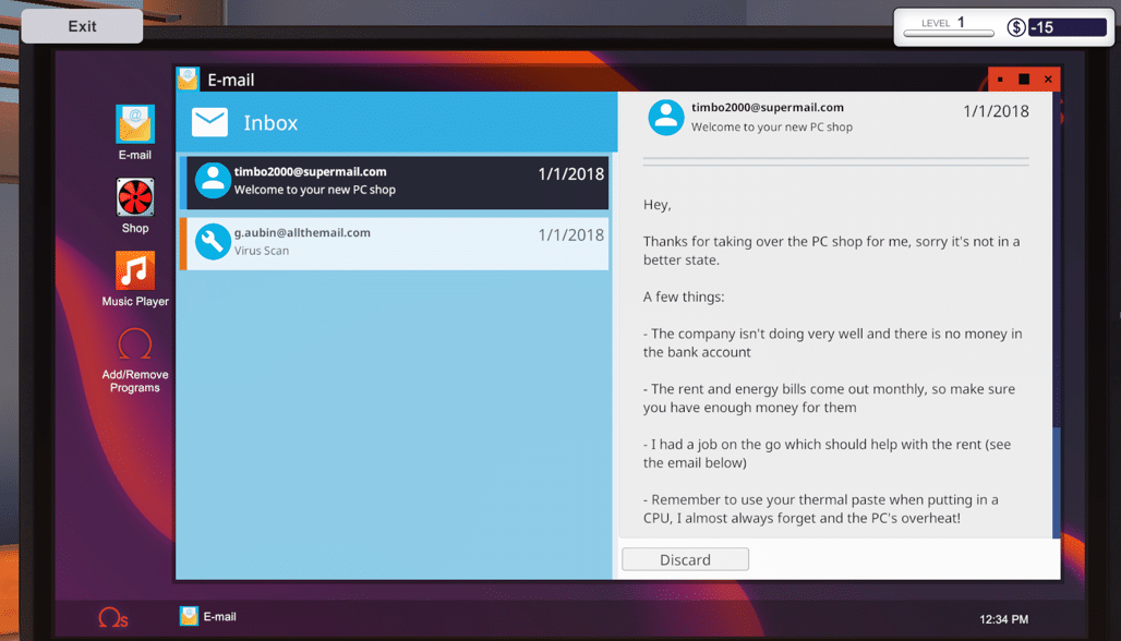 In dem der Spieler den Computer anklickt, befinden sich im Mailpostfach die ersten Instruktionen und die Hintergrundgeschichte. Die Karriere beginnt mit einer E-Mail vom Onkel Tim, der einem das PC-Geschäft übereignet. Folglich rutscht der Spieler in die „Geschäftsführerrolle“ und die Simulation erzeugt den Eindruck, wie manch Karriere, in einem kleinen Zimmer oder der Garage entstanden zu sein.