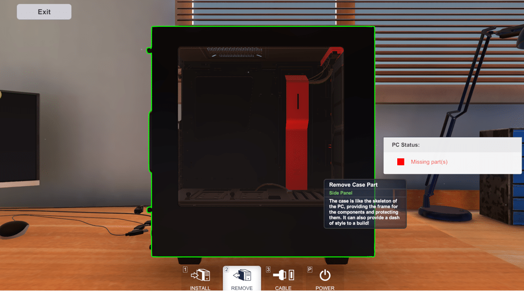 Jede Komponente, die entfernt werden soll, wird farblich und mit dem Namen der Komponente hervorgehoben, sodass nicht etwas Falsches entfernt wird Die farbliche Hervorhebung ist in den Ampelfarben gehalten und hilft dem Spieler, sollte eine Komponente nicht direkt entfernt werden können, da z.B. vorher Kabel abgestöpselt werden müssen. So startet jeder Auftrag, wo Hardware benötigt wird, mit dem Entfernen einer Seitenblende und der dazugehörigen Schrauben.