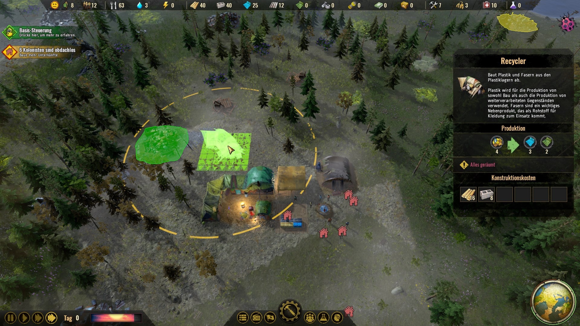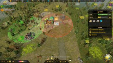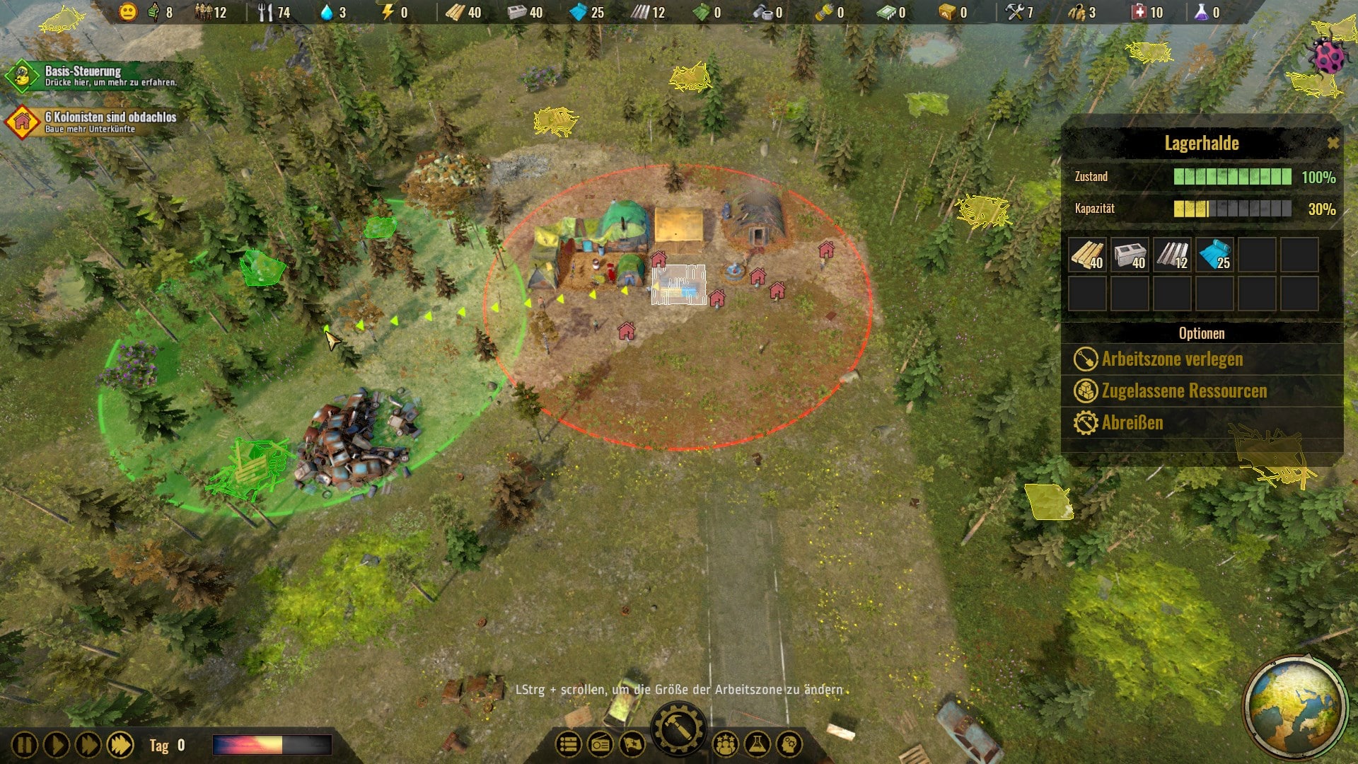 Die Rohstoffbeschaffung spielt selbstverständlich auch eine wichtige Rolle. Bauholz, Kleidung oder Medizin fallen nämlich nicht vom Himmel. Baumaterial wird einfach gesammelt, indem ihr über euren Lagerplatz eine Arbeitszone zuweist. Freie Träger werden sich dann aufmachen und die Rohstoffe einsammeln.