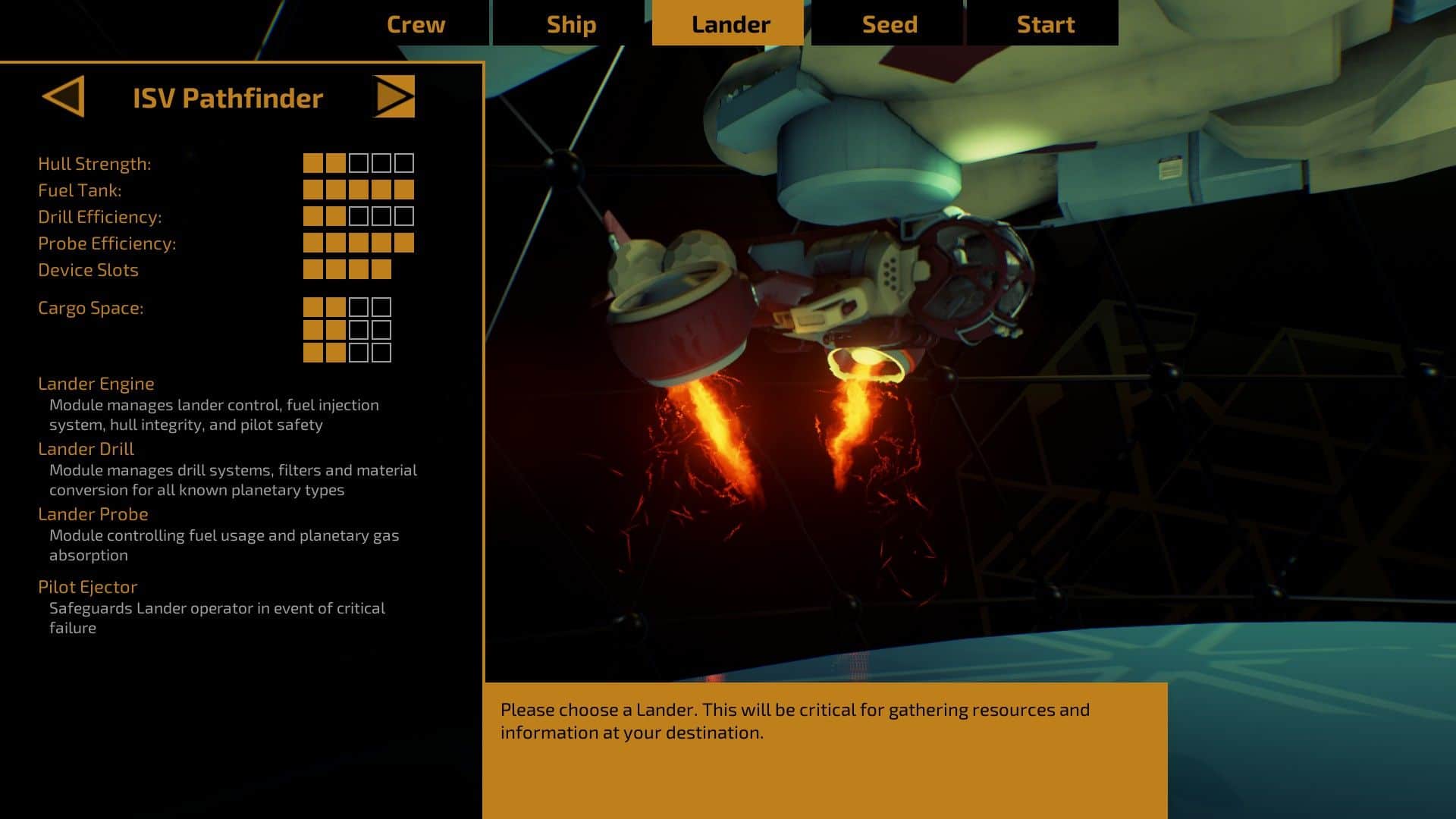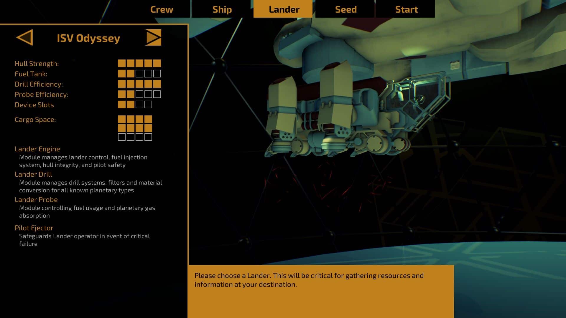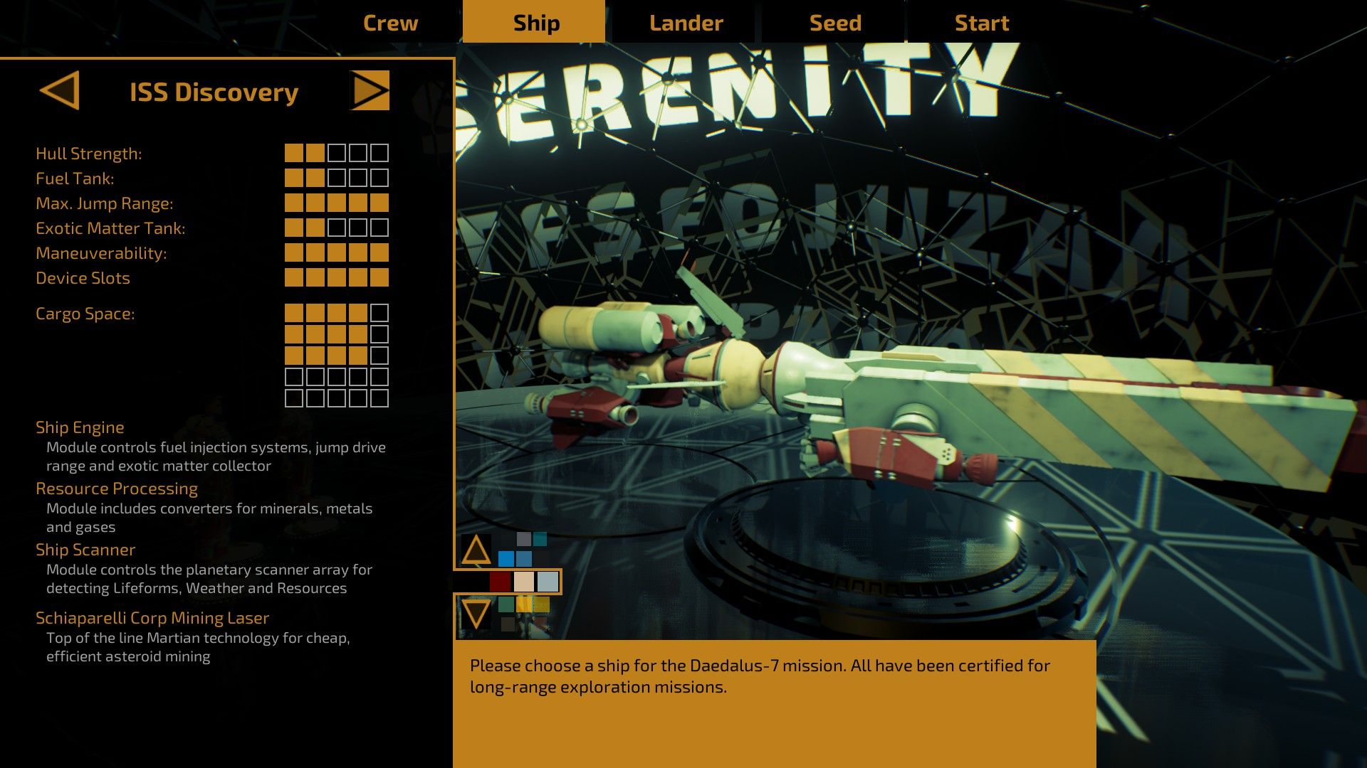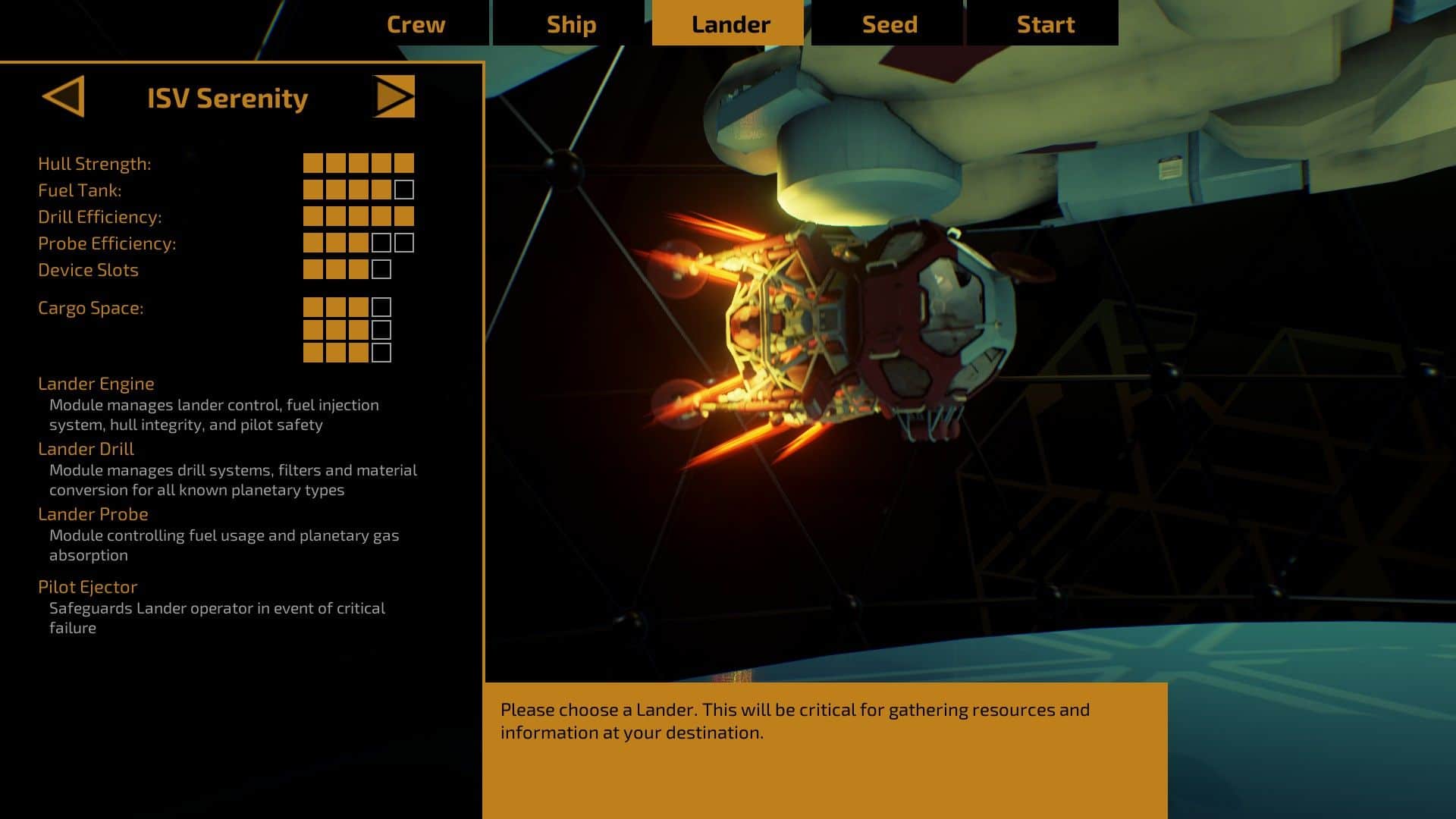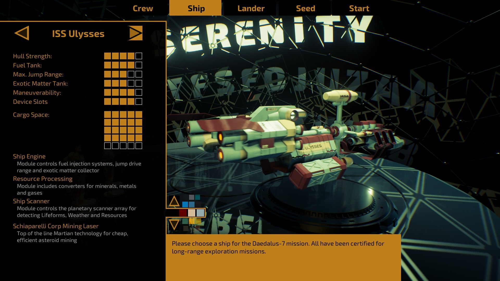 Bevor wir mit der Mission nun endlich starten können, dürfen wir aber noch ein Landemodul aussuchen. Wieder stehen uns drei verschiedene Fluggeräte zur Verfügung. Jedes wieder mit Vor- und Nachteilen. Die Odyssey hat zwar eine hohe Hüllenstärke und könnte somit auch gefährlicheren Umgebungen trotzen, sie hat aber keinen großen Tank für Treibstoff. Die Ausflüge auf einen Planeten sollten sich also kurz halten. Serenity ist wie die Ulysses ein ausgewogenes Schiff. In allem gut, aber nicht überragend. Zu letzt der Pathfinder. Für Forschungsmissionen ist er perfekt, auch wenn man mit ihm nicht viel von einem Planeten mitbringen kann. Man sollte sich genau überlegen, ob man landet oder eben nicht.
