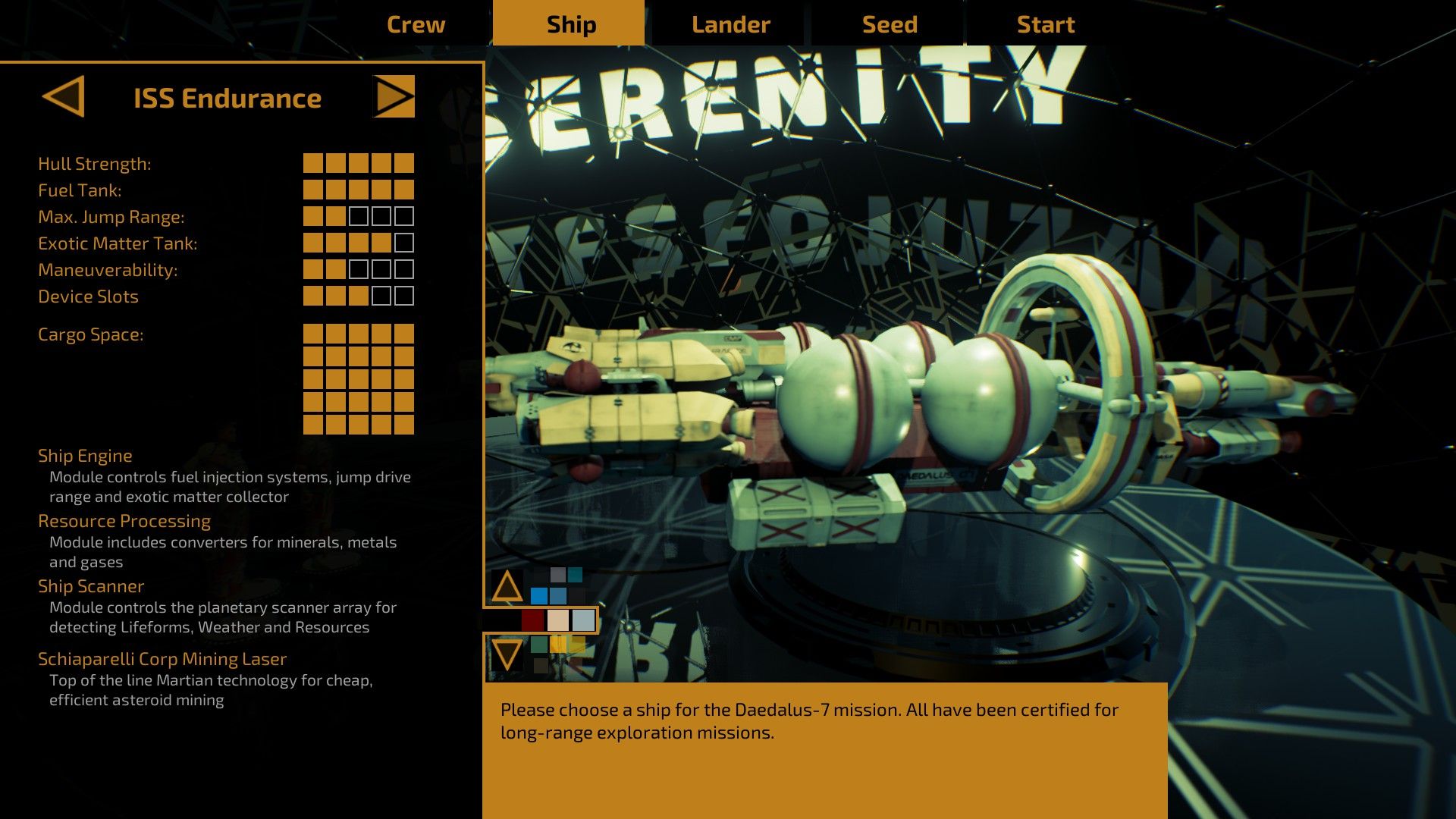 Mit schweren Entscheidungen geht es direkt weiter. Neben der Crew müsst ihr auch euer Schiff auswählen. Die Ulysses ist ein ausgewogenes Schiff. Alle Werte sind nicht überragend, aber auch nicht schlecht. Mit dem Allrounder lässt sich gut arbeiten und es war für mich am Anfang das Lieblingsschiff (bei meinen unzähligen Versuchen). Die Endurance hat keine große Sprungreichweite und somit dauert die Reise zurück zur Erde länger. Dafür hat sie einen großen Frachtraum, hält viel aus und kann öfter in den Hyperraum als die anderen Schiffe. Das letzte der drei Schiffe ist die Discovery. Meiner Meinung nach ein Schiff für den anspruchsvollen oder erfahrenen Spieler. Sie kann weiter durch den Hyperraum fliegen, dafür sind aber nur zwei Reisen möglich. Auch die Hülle des Schiffes ist nicht die beste. Falls es doch zu einem Gefecht kommt, ist die Discovery nicht die erste Wahl. Ihr solltet euren eigenen Spielstil finden und das Schiff anfangs auch eurem Können anpassen. Seid ihr erstmal mit dem Spiel vertraut und habt es einmal zur Erde geschafft, probiert so viel wie möglich mit den Crews und den einzelnen Schiffen herum. Es entstehen ganz neue Herausforderungen.