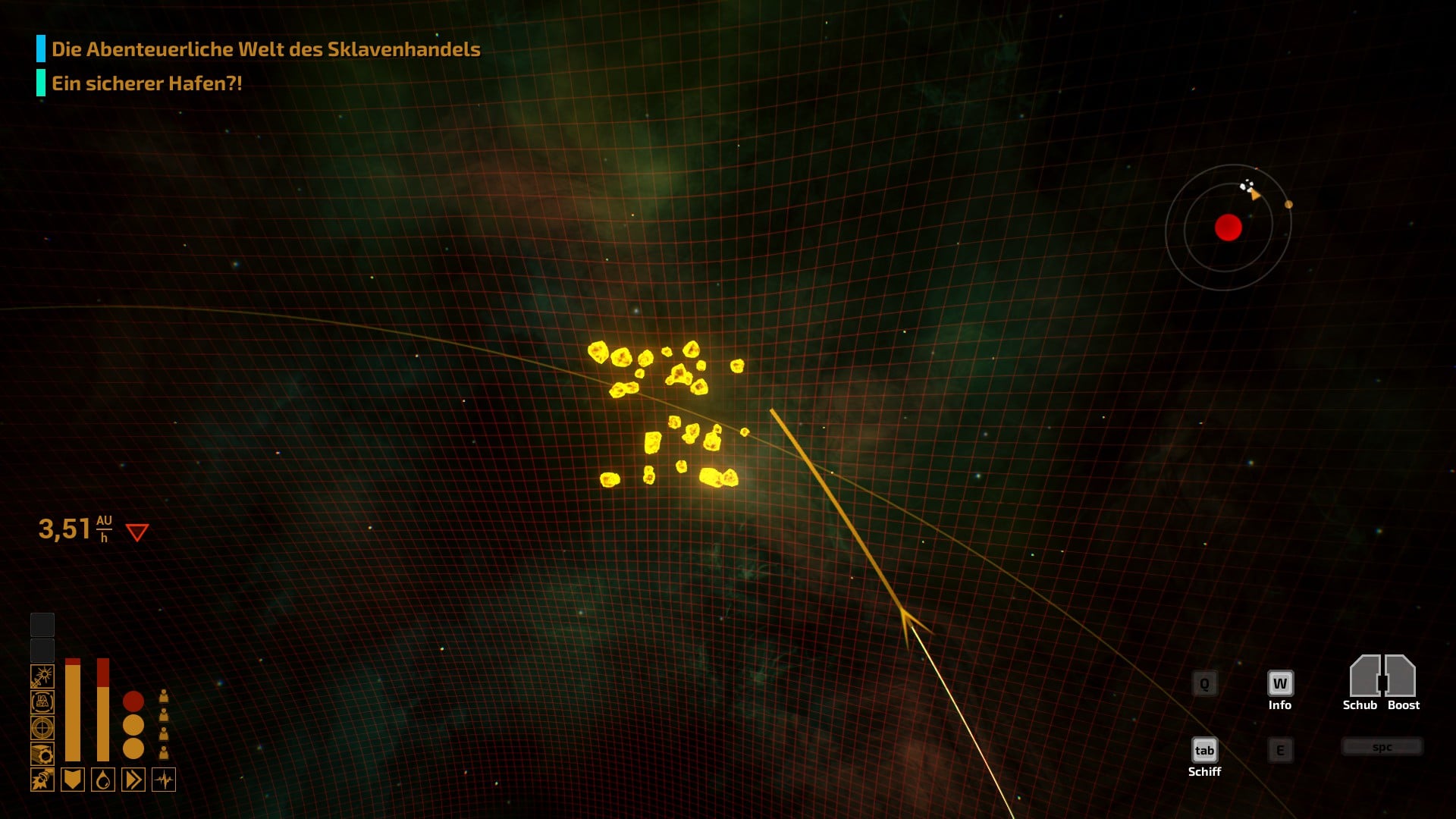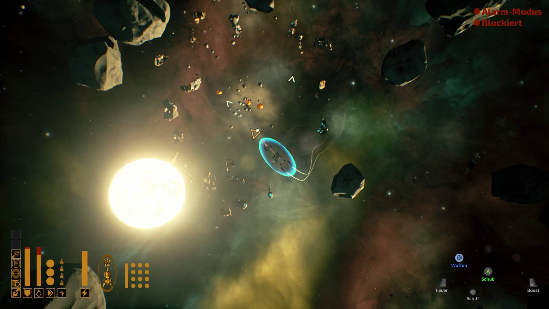 Es wird vom Entwickler empfohlen und von mir ebenso. Spielt das Spiel mit dem Controller! Unbedingt! Solltet ihr das Spiel zum ersten Mal starten, nehmt euch die Zeit und spielt das „Tutorial“. Mit dem Controller habt ihr wesentlich mehr Feingefühl, wenn es um das Landen auf einem Planeten oder das bloße Eintreten in den Orbit geht. Solltet ihr einen Planeten mit hoher Gravitation zu schnell anfliegen und bremst schlagartig, kommt es gut und gerne dazu, dass ihr voll auf den Planten zu rauscht. Nicht allzu wild, es geht ja nur etwas am Schiff kaputt.
