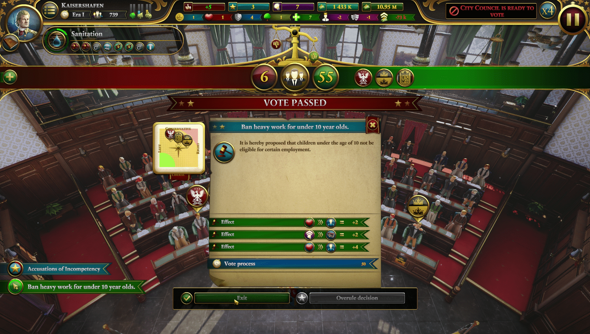 Und dieses Wohlwollen wird für euch noch entscheidend sein, denn ihr dürft nicht immer so frei hantieren, wie es euch gerade beliebt. Wollt ihr beispielsweise das Budget für den Gesundheitssektor anheben oder eine neues Gesetz durchsetzen, bedarf dies der Zustimmung des Stadtrats. Hier wird demokratisch per einfachem Mehrheitsentscheid abgestimmt, wobei die drei jeweils vertretenen Parteien euch keinesfalls immer zugetan sind.
