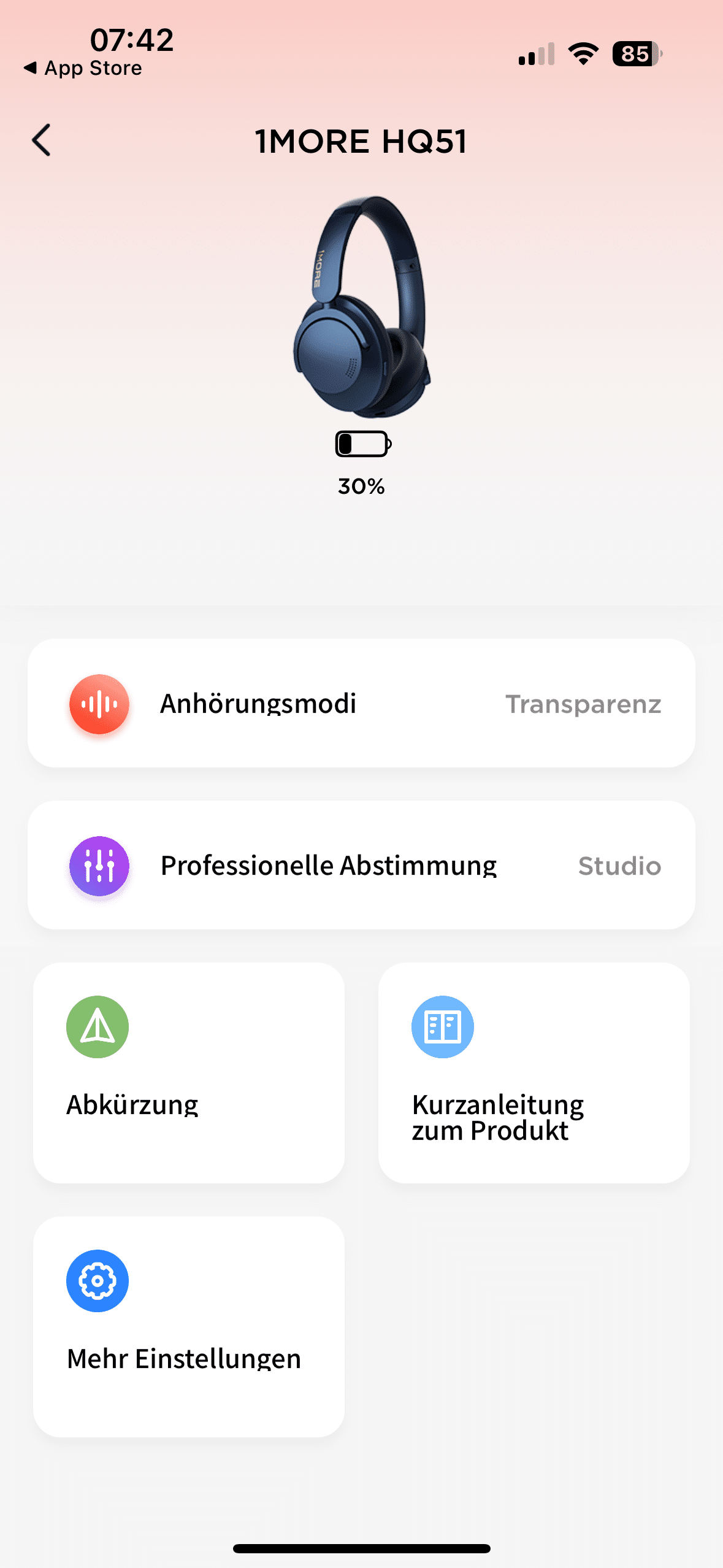 Als Begleit-App kommt die 1MORE App zum Einsatz, bei der zunächst einmal die äußerst holprige Übersetzung ins Auge sticht. Anhörungsmodi sind beispielsweise die Sound-Modi (ANC, Transparenz oder Normal) und im Bereich Abkürzung finden sich Raumklang und Low Latency-Modus.