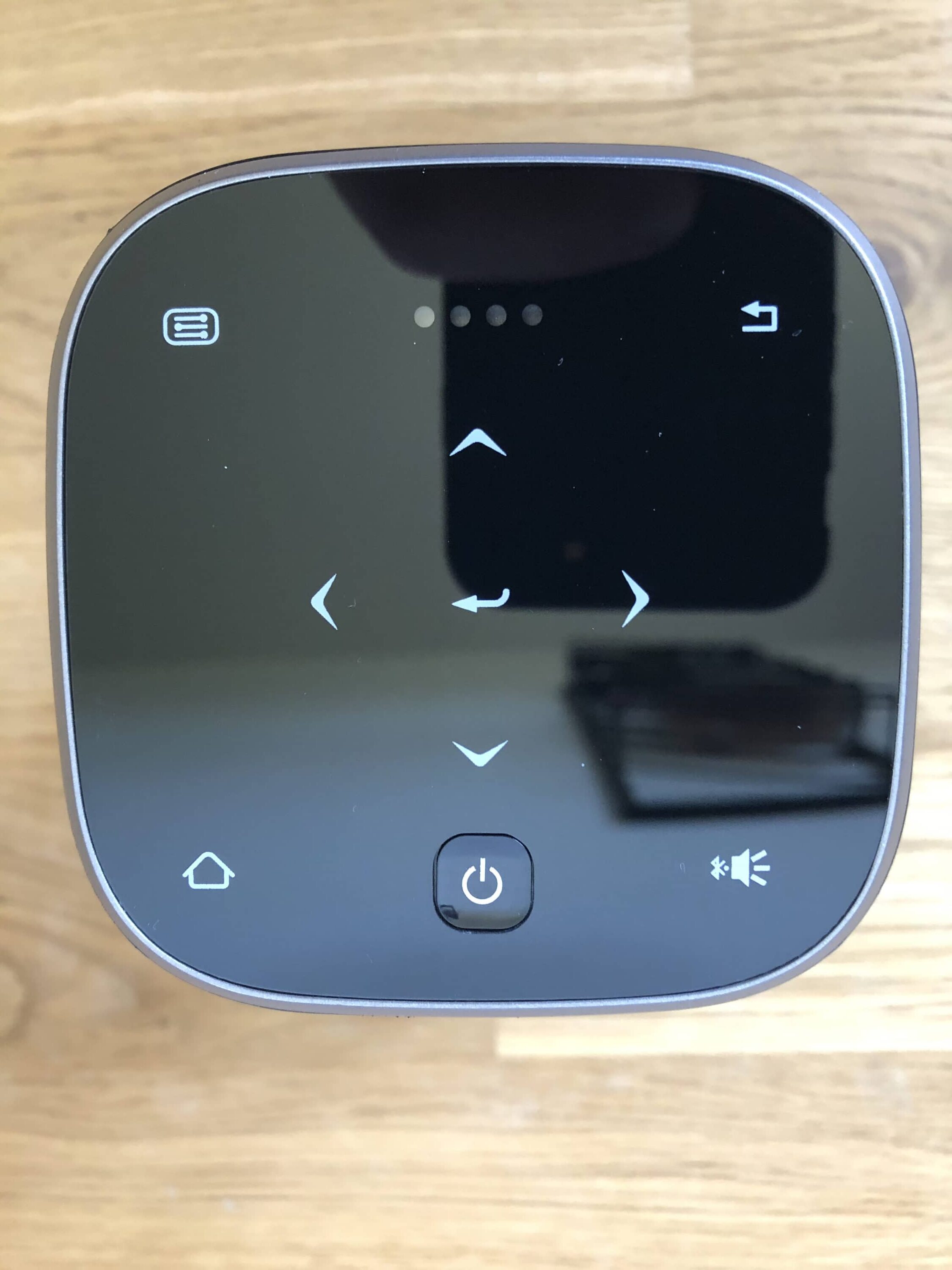 Alternativ zur Fernbedienung lässt sich der Beamer auch an der oberen Bedienoberfläche steuern. Hier befinden sich in etwa die Knöpfe, welche auch auf der Fernbedienung selbst zu finden sind. Da man sich hier jedoch mitunter durch Untermenüs klicken muss, ist der Griff zur klassischen Fernbedienung vorzuziehen.