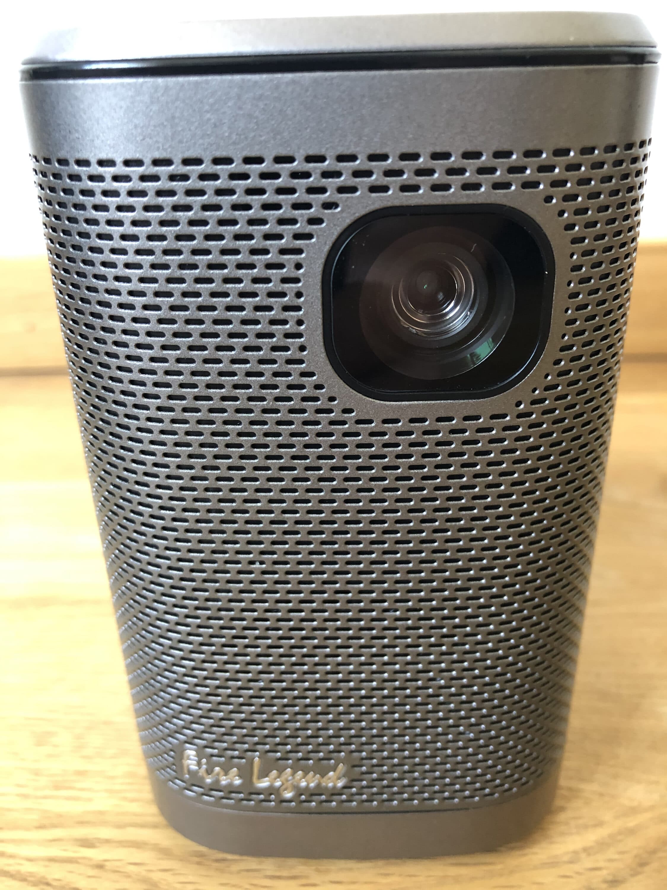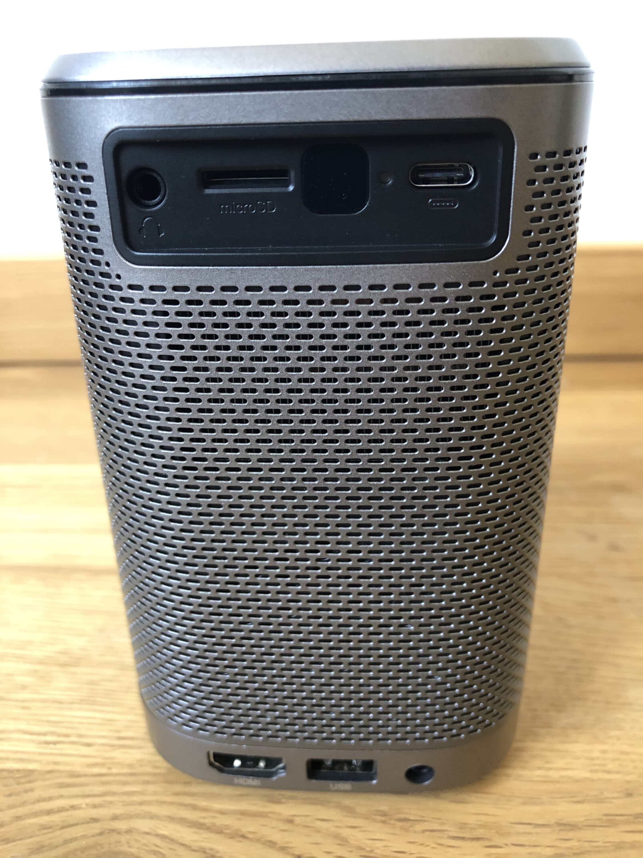 Die Verarbeitung des Mini-Beamers fällt sofort positiv auf. Hier setzt der Hersteller auf hochwertiges Aluminium, das ein wenig an die Mini-Lautsprecher aus dem Hause Sonos (Sonos One) erinnert. Unter dem metallenen Gitter-Geflecht kann man bereits die beiden Lautsprecher mit einer Leistung von jeweils 5 Watt erkennen. Der knapp 700 Gramm leichte Beamer fühlt sich sehr gut an und lässt sich bequem mit einer Hand tragen. An der Unterseite des LED-Beamers befindet sich außerdem ein praktisches Gewinde, mit dessen Hilfe sich der Projektor auch spielend leicht auf gängige Stative schrauben lässt.