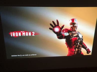 Für meinen Praxistest habe ich zu meinem Fire TV Stick 4K aus dem Hause Amazon gegriffen. Die Verbindung war dabei spielend leicht. Einmal im HDMI-Eingang des Beamers eingesteckt wurde er sofort erkannt. Nun musste ich nur noch den HDMI-Port im Hauptmenü auswählen und schon konnte es losgehen. Da mein Fire TV Stick bereits eine ganze Weile am Netz hing, befand er sich beim Aufrufen des richtigen Eingangs im Ruhemodus. Mir strahlte ein leuchtend roter Iron Man des Bildschirmschoners entgegen. Auf den ersten Blick war ich wirklich positiv überrascht.