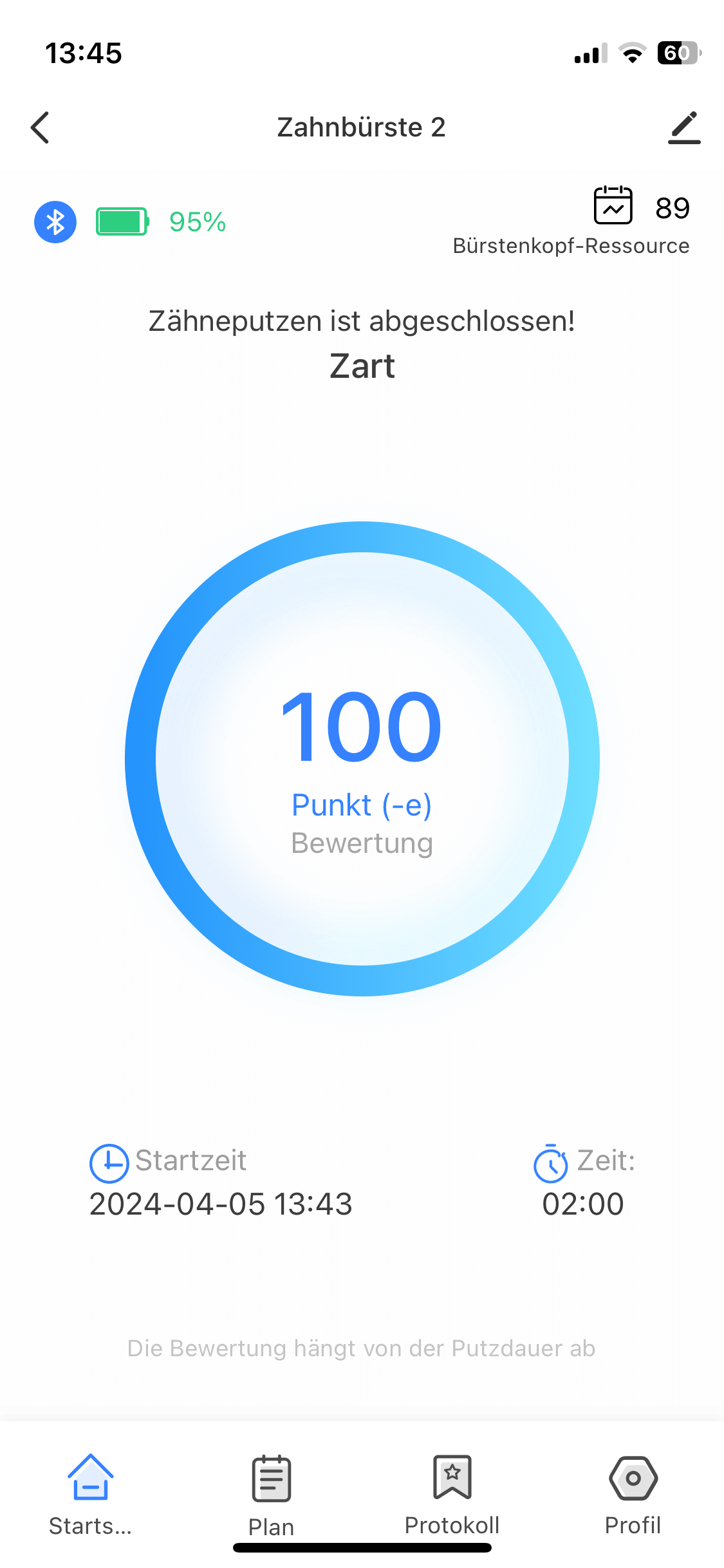 Der Modus, den du über die App ausgewählt hast, lässt sich an der Zahnbürste über den Punkt „Smart“ auswählen. Weiterhin kannst du mithilfe der App überwachen, wie umfassend deine Reinigung ist. Während der Reinigung weist dich die App nicht nur auf Bereichswechsel bei deinem Gebiss hin. Obendrein erhältst du im Anschluss an die Reinigung eine Punktzahl dafür, wie umfassend das Zähneputzen war. Hier sind maximal 100 Punkte möglich. Deine Ergebnisse werden dann getrackt und lassen sich im Nachhinein nachvollziehen.