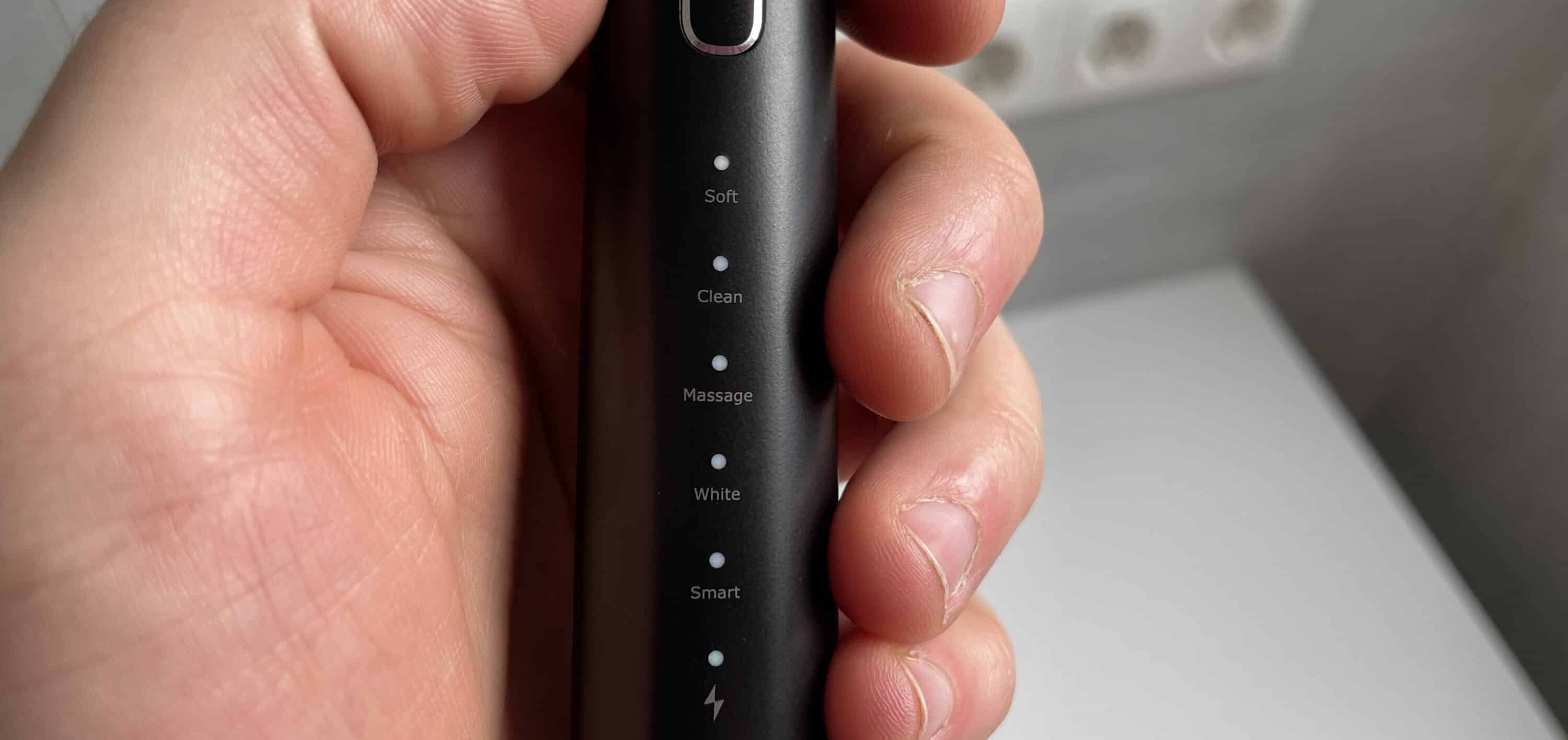 Die Steuerung der elektrischen Zahnbürsten ist selbsterklärend. Alles wichtige befindet sich an der Front. Sobald der Bürstenkopf aufgesetzt wurde und der Akku aufgeladen ist, kannst du sie direkt einsetzen. Eingeschaltet wird sie über den Button an der Vorderseite, welcher durch den dünnen Metallrahmen schnell erkannt wird. Mit dem ersten Daumendruck auf die Taste aktivierst du die Zahnbürste.