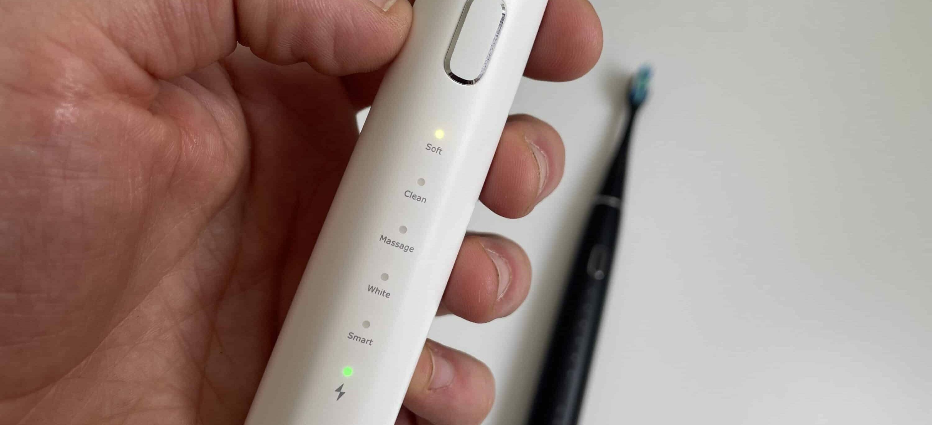 Mithilfe weiterer Klicks navigierst du durch die Modi. Dir stehen mit „Soft“, „Clean“, „Massage“, „White“ und „Smart“ fünf zur Auswahl. Im Modus „Soft“ erhältst du die sanfteste Zahnreinigung. Eine Standardreinigung gibt es bei „Clean“. In „Massage“ erhält dein Zahnfleisch eine Massage, welche die Durchblutung anregen soll. „White“ erhält durch Polieren das Weiß deiner Zähne aufrecht und „Smart“ arbeitet nach dem in der App festgelegten Szenario. Sobald ein Modus für einige Sekunden aktiv war, sorgt ein Klick auf den Button dafür, dass sich die Zahnbürste ausschaltet.