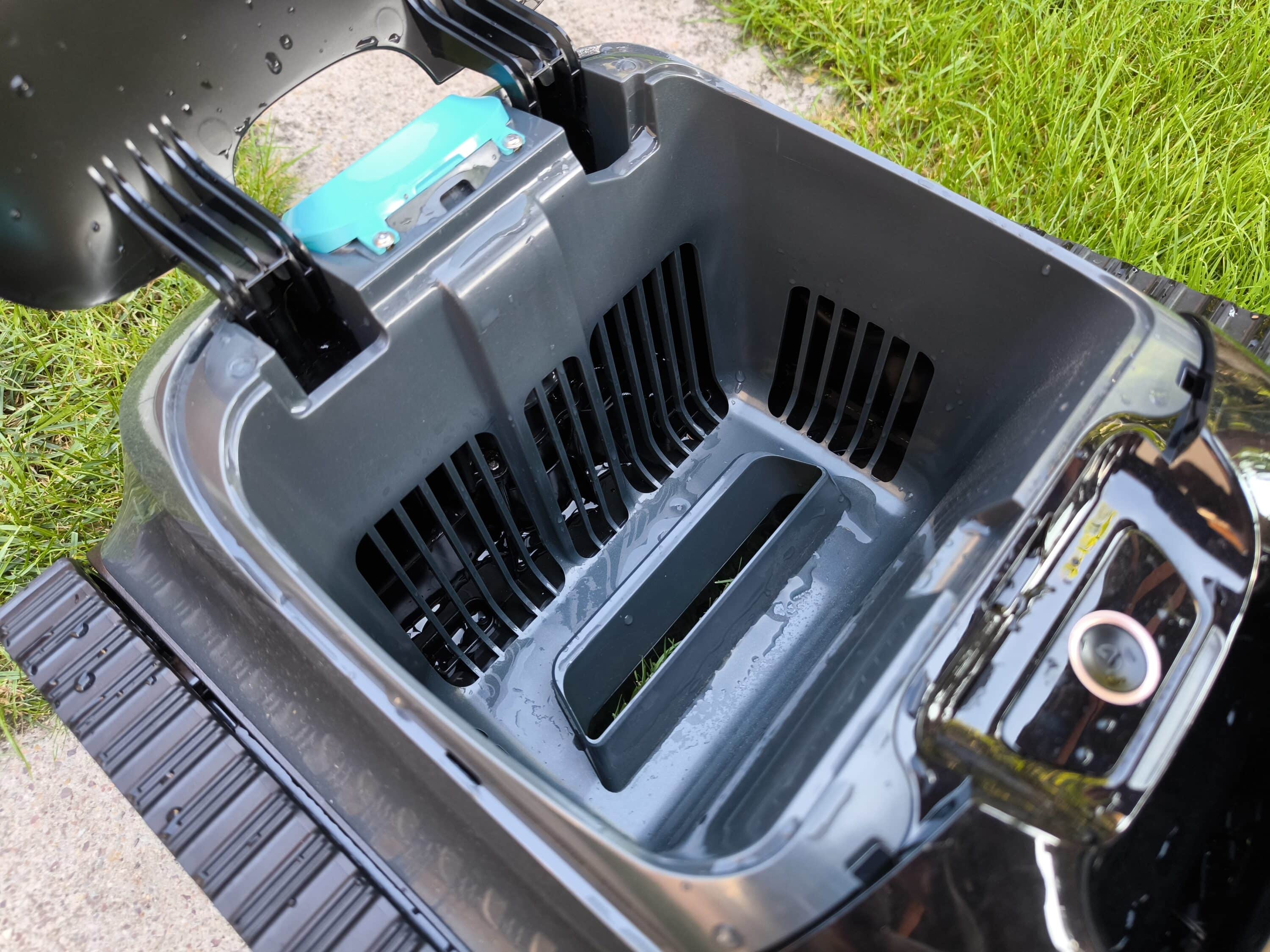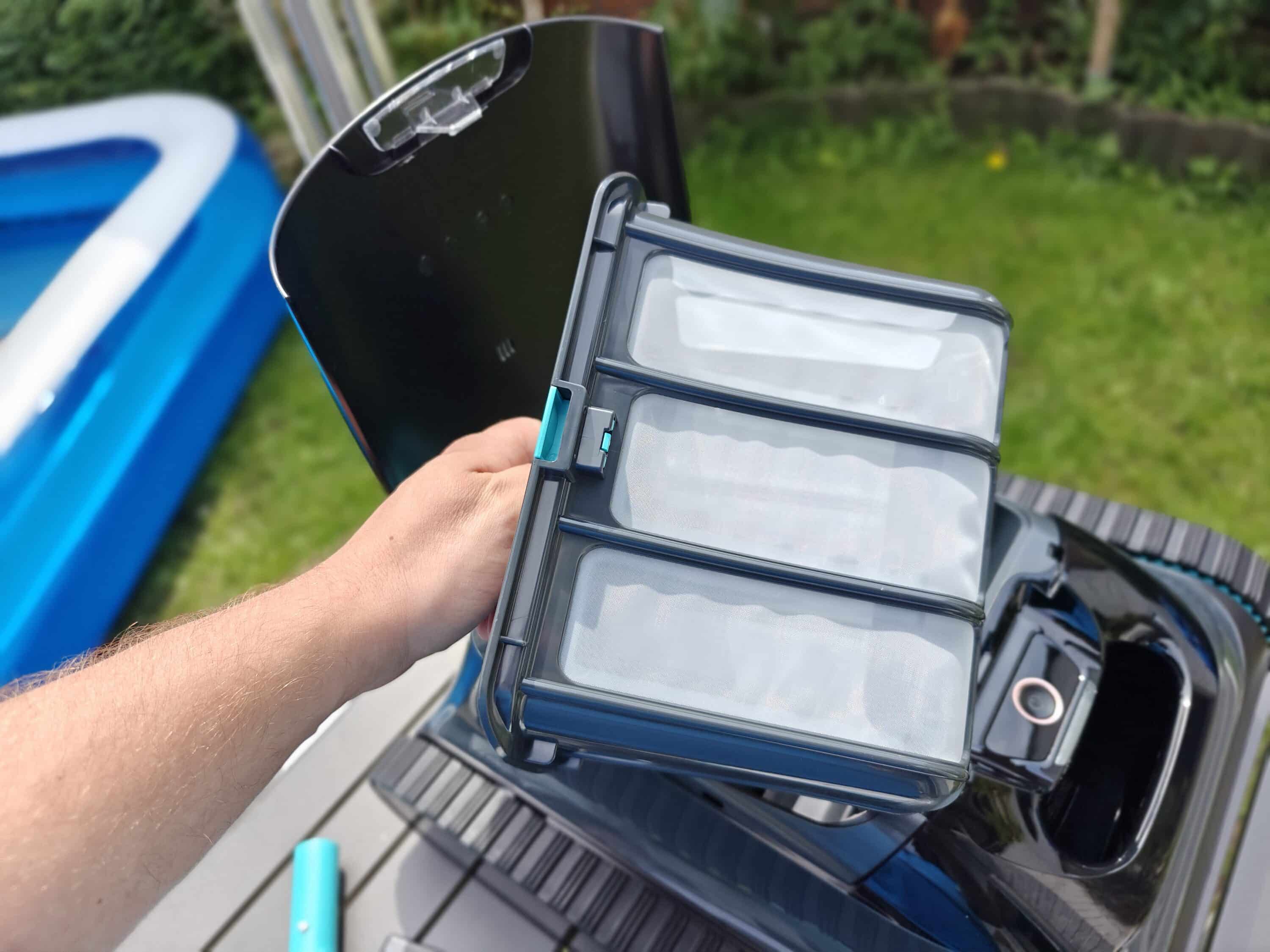 Hierfür muss der Deckel des Roboters nach oben aufgeklappt werden, um an den Filterkorb zu gelangen. Mit dem türkisfarbenen Griff kann der Filterkorb bequem herausgezogen werden. Um den Filterkorb zu öffnen, muss zunächst noch die Verriegelung entfernt werden, was durch Drücken des türkisfarbenen Knopfes geschieht.