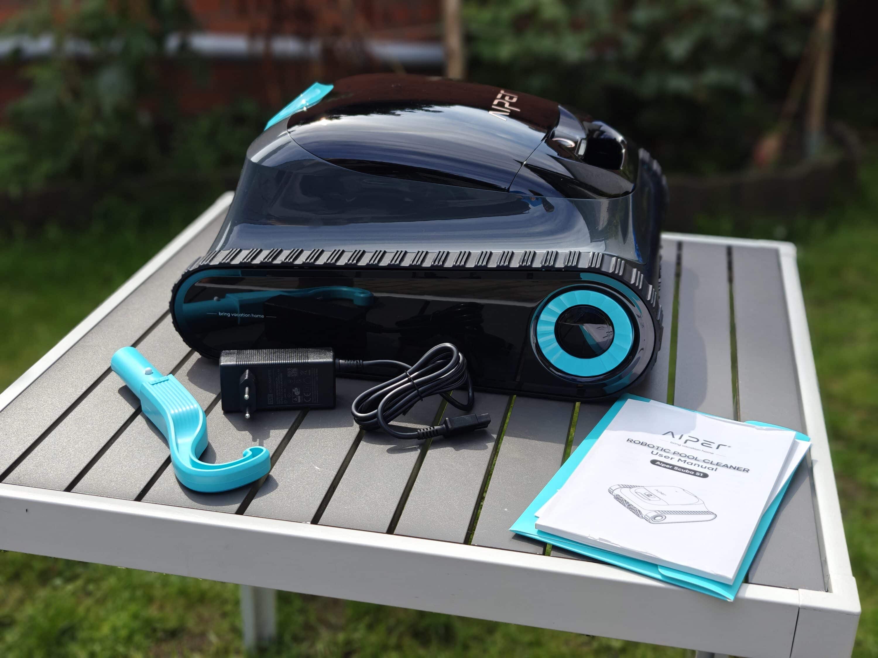 Der Lieferumfang des AIPER Scuba S1 beschränkt sich auf das Wesentliche. So umfasst dieser den Pool-Reinigungsroboter selbst wie auch das passende Netzteil. Neben dem Greifhaken, der an einer Poolstange montiert werden kann, gehören auch die üblichen Papiere zum Zubehör.