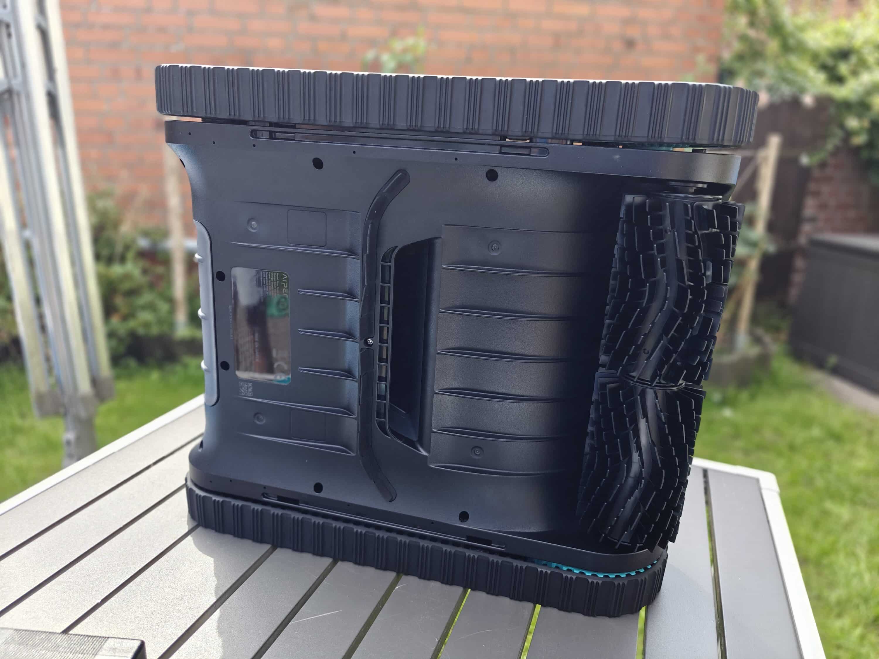 Optisch präsentiert sich der AIPER Scuba S1 vor allem als flacher Reinigungsroboter. An der Vorderseite sind zwei Walzenbürsten montiert, während sich an der Rückseite der Ladeanschluss des Roboters befindet. Die Seiten sind mit je einer Raupenkette mit den typischen AIPER Akzenten verziert, die in einem türkisfarbenen Kreis an der Vorderseite enden. Was das Gewicht anbelangt, so bringt der AIPER Scuba S1 mit 7,5 Kilogramm doch ein ordentliches Stück auf die Waage. Abhilfe schafft hier der Tragegriff des Scuba S1, der nicht wie üblich nach außen, sondern in das Innere des Gehäuses geführt ist.