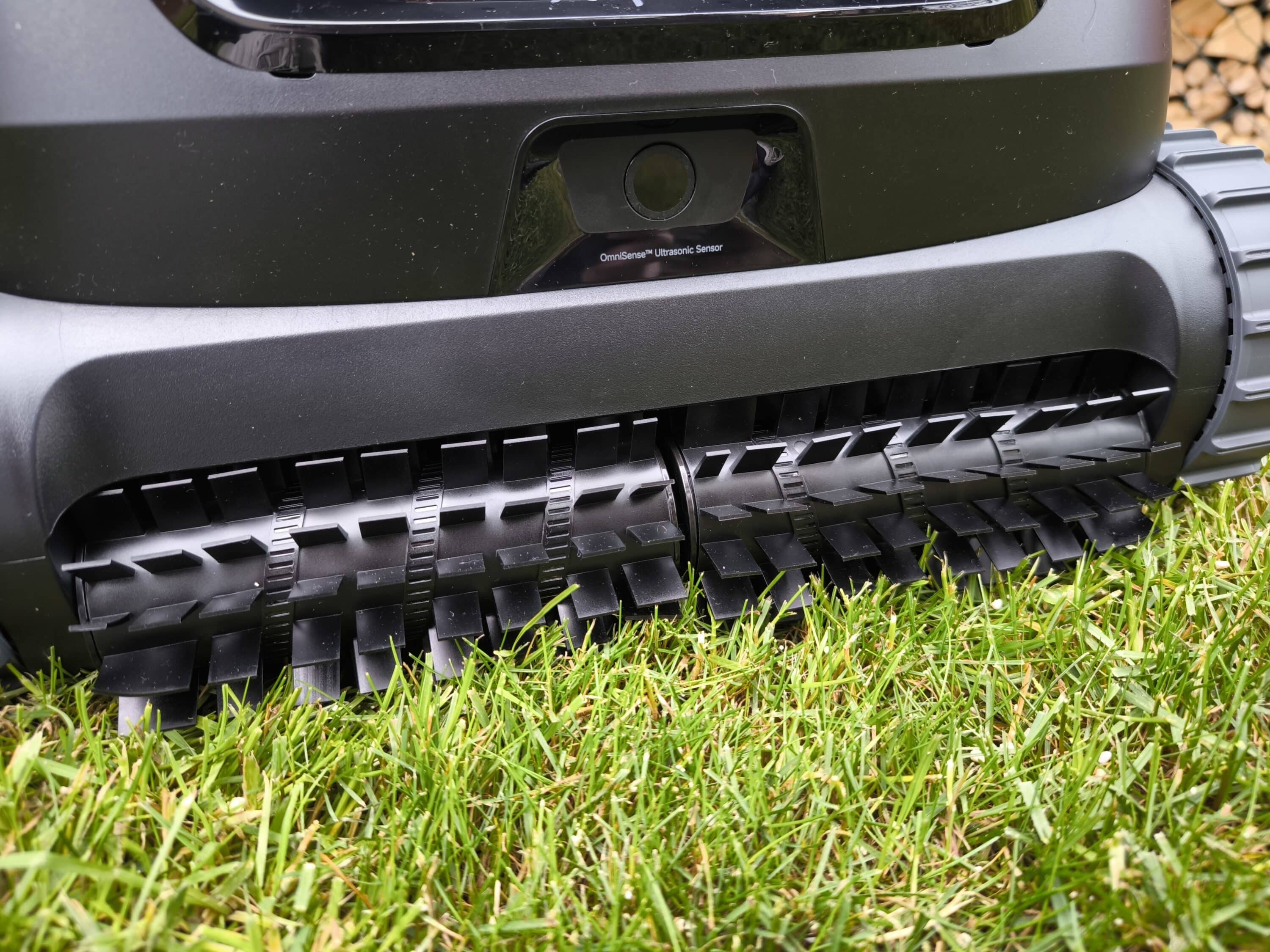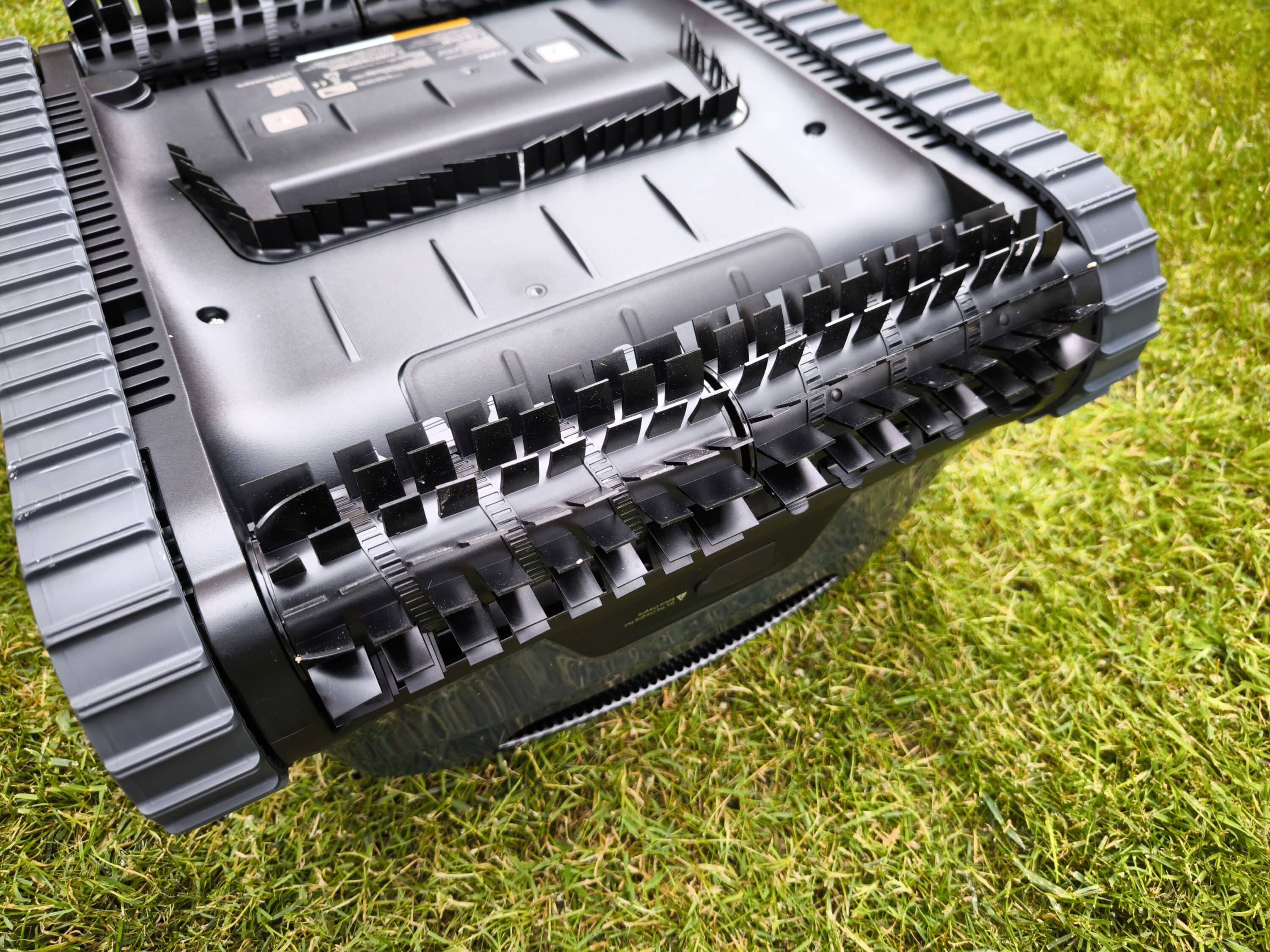 Die Unterseite verfügt über eine große Absaugöffnung und eine gummierte Leiste, die ebenfalls zur Bodenreinigung beiträgt. Im Blickfeld erscheinen erneut die Doppelwalzenbürsten – ergänzt durch die Pins für das Ladedock, das Typenschild und eine großflächige Wasserablaufklappe.
