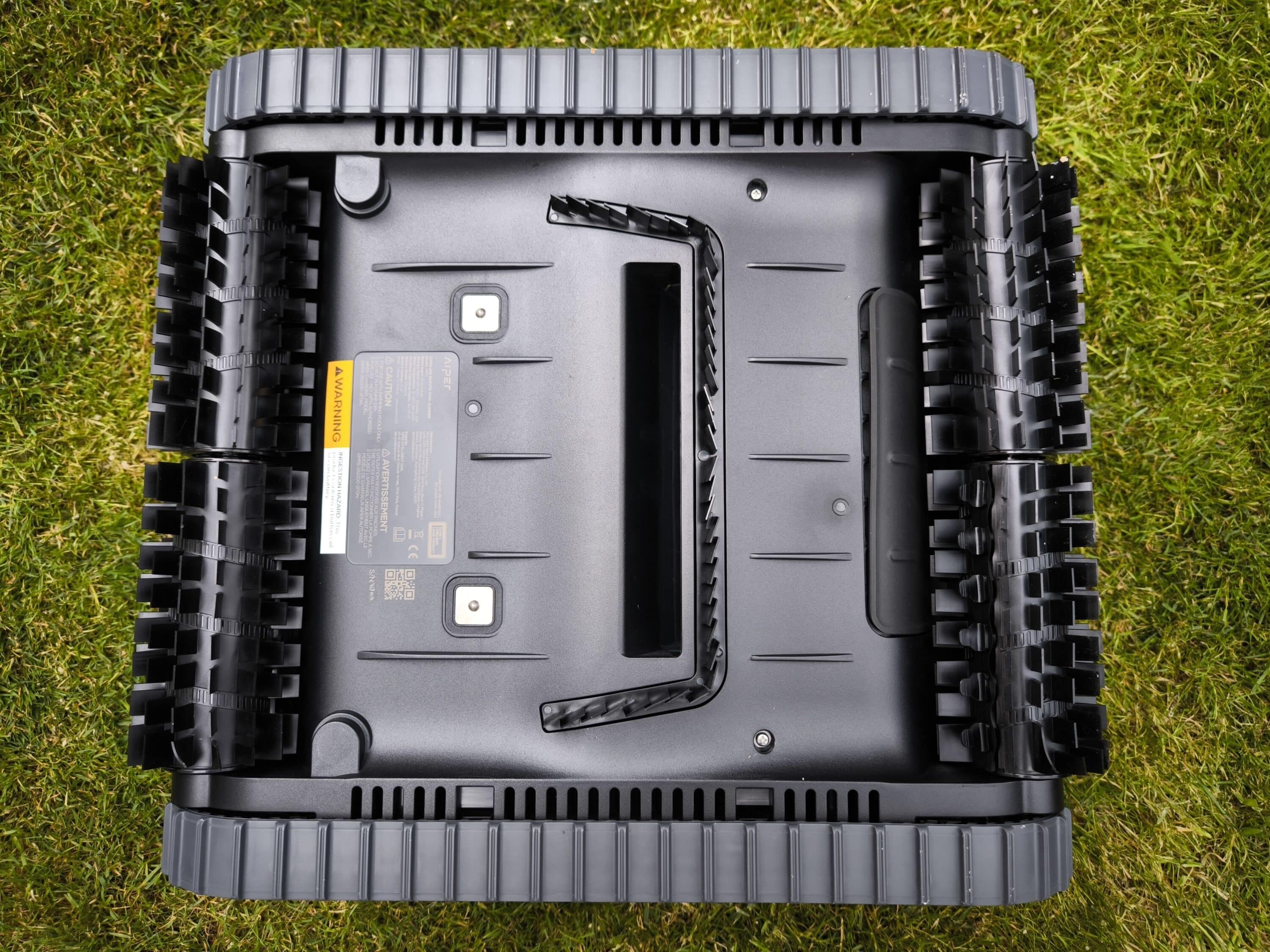 Im Gegensatz zum AIPER Scuba S1 präsentiert sich der Scuba X1 deutlich voluminöser und bringt zudem noch einige Kilogramm mehr auf die Waage. Das ergibt natürlich Sinn, denn mehr Motoren bzw. Sensoren führen zu zusätzlichem Gewicht. Wie bei Geräten in diesem Preissegment üblich, sind auf beiden Seiten die Raupenketten und auf der anderen Seite die Doppelwalzenbürsten zu sehen. Erwähnenswert dabei ist, dass der AIPER Scuba X1 diese sowohl vorne als auch hinten mitbringt. Ansonsten finden sich die für AIPER typischen Akzente in Türkis, beispielsweise an den Ringen auf der Vorderseite und am Griff des großen Filterkorbs.
