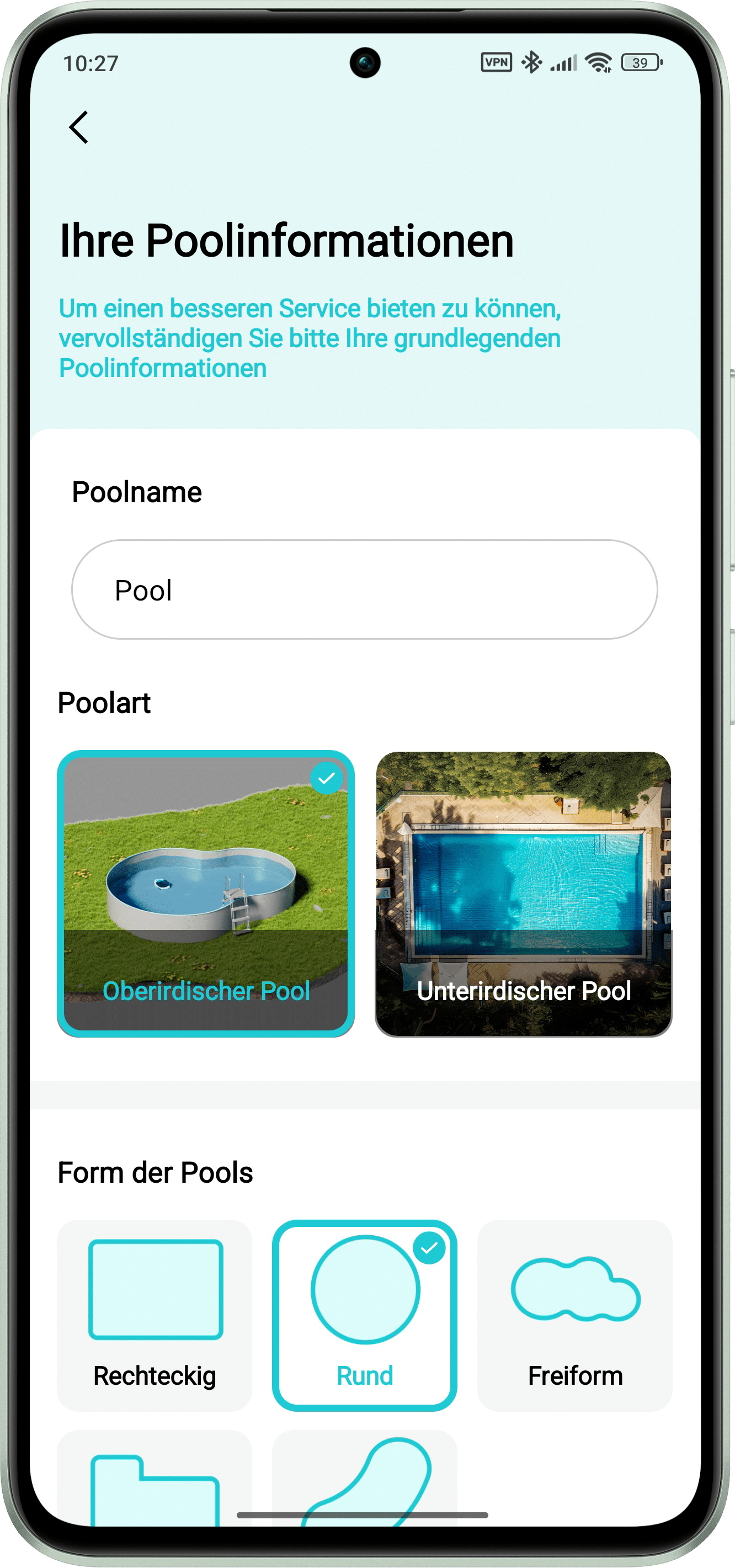 | Mögliche Poolformen | Rechteckig, Rund, Nierenförmig, Zufällig |