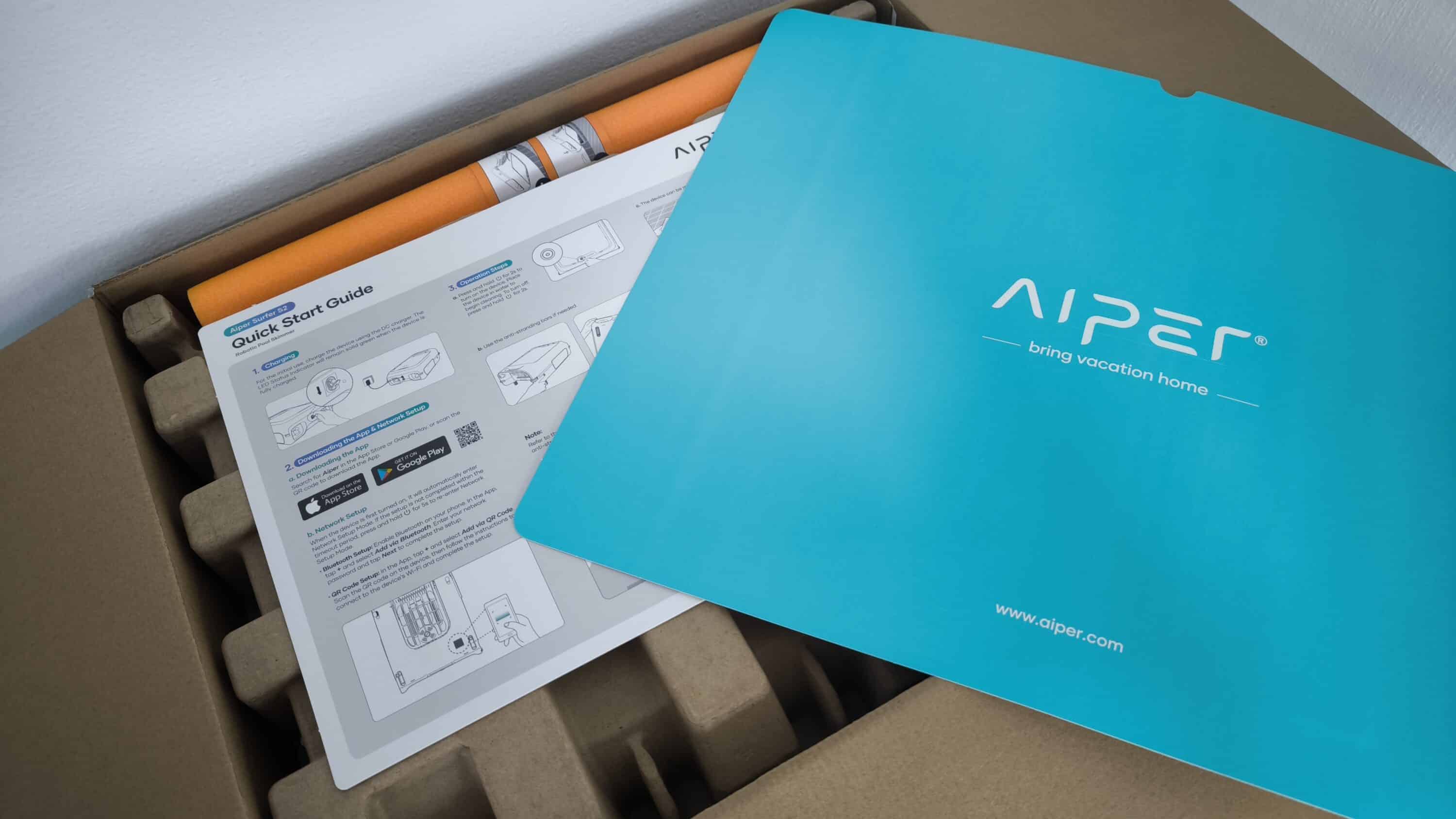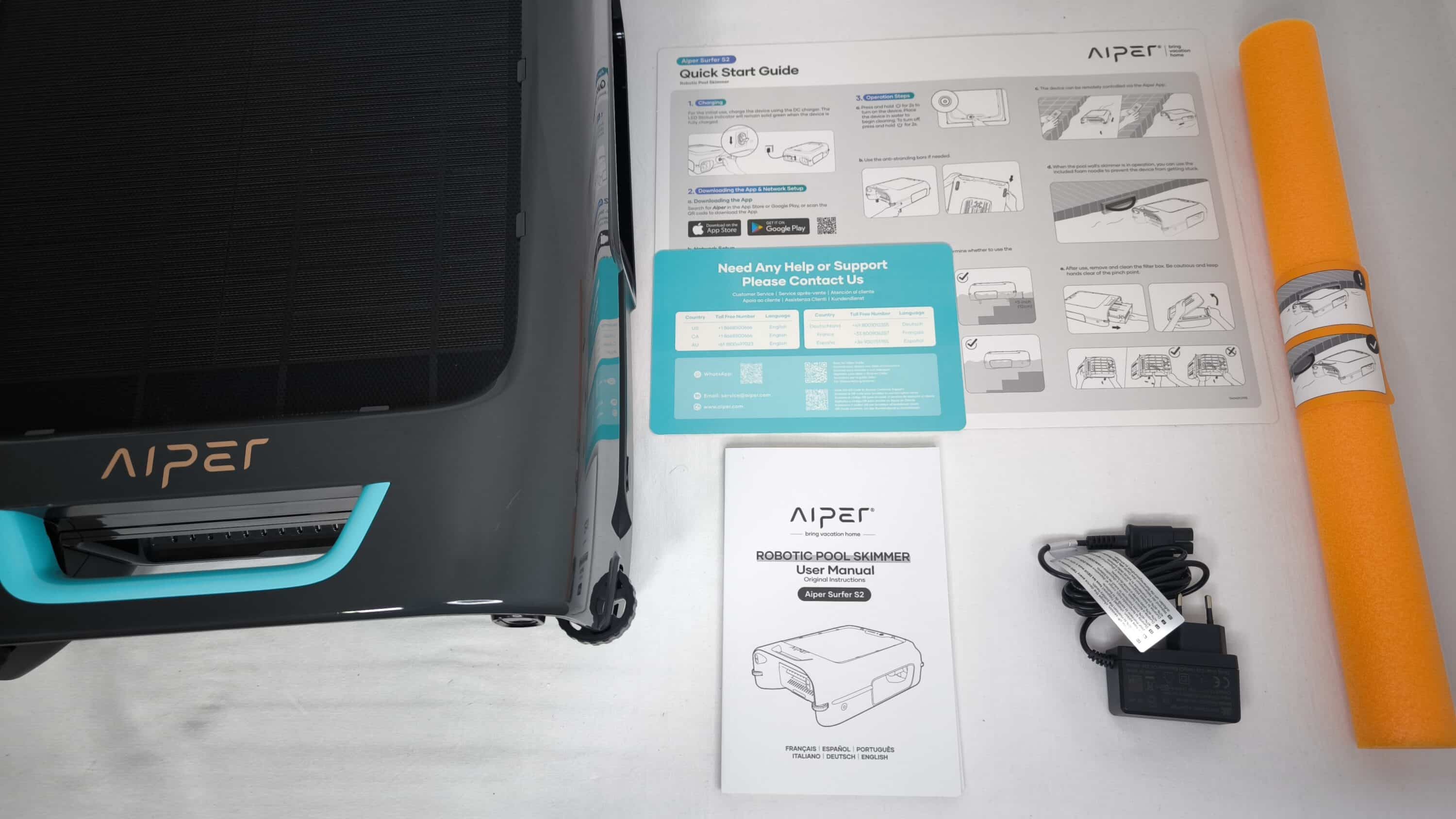 Der Lieferumfang des AIPER Surfer S2 konzentriert sich auf das Wichtigste und lässt sich ohne viel überflüssigen Schnickschnack zusammenfassen. Mitgeliefert werden demnach der Poolroboter selbst samt zugehörigem Netzteil sowie die üblichen Unterlagen. Letztere umfassen mitunter eine Bedienungs- bzw. Schnellstartanleitung, deren Umschlag in Türkis gehalten ist. Erwähnenswert ist die beiliegende Schwimmnudel, die in den eigenen Pool-Skimmer eingesetzt werden kann. Dadurch wird verhindert, dass der Surfer S2 durch die Strömung von seiner Bahn abgebracht wird.