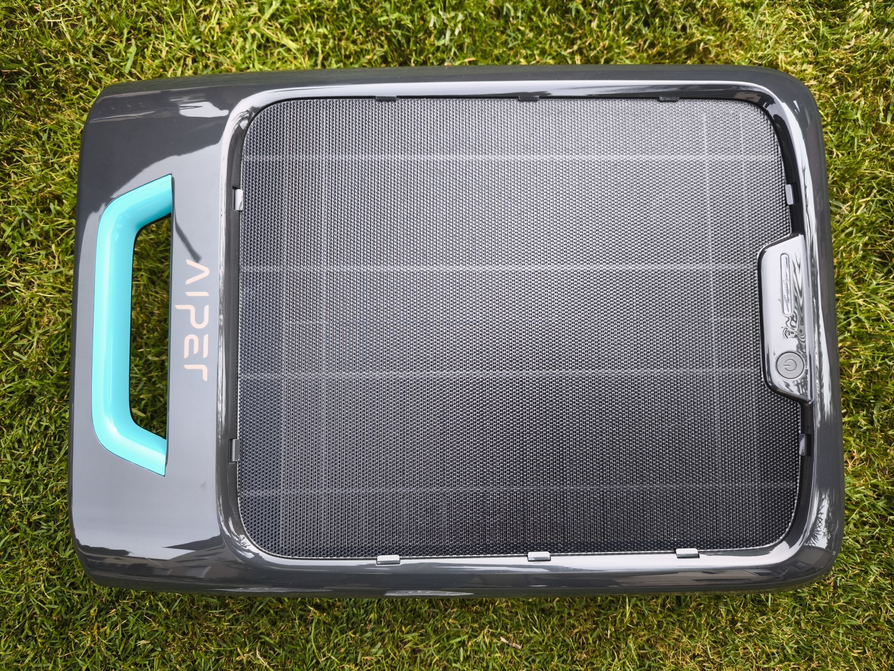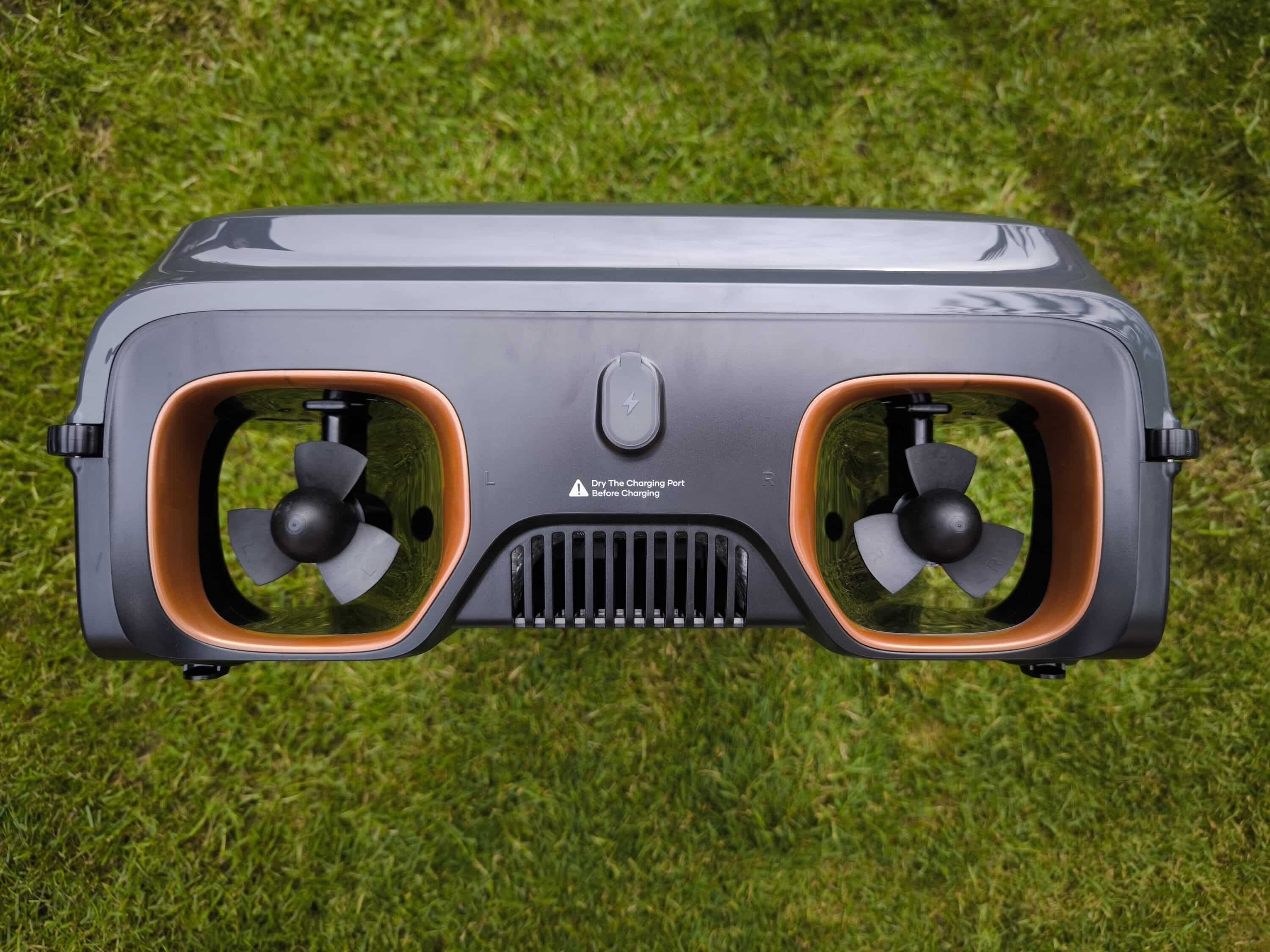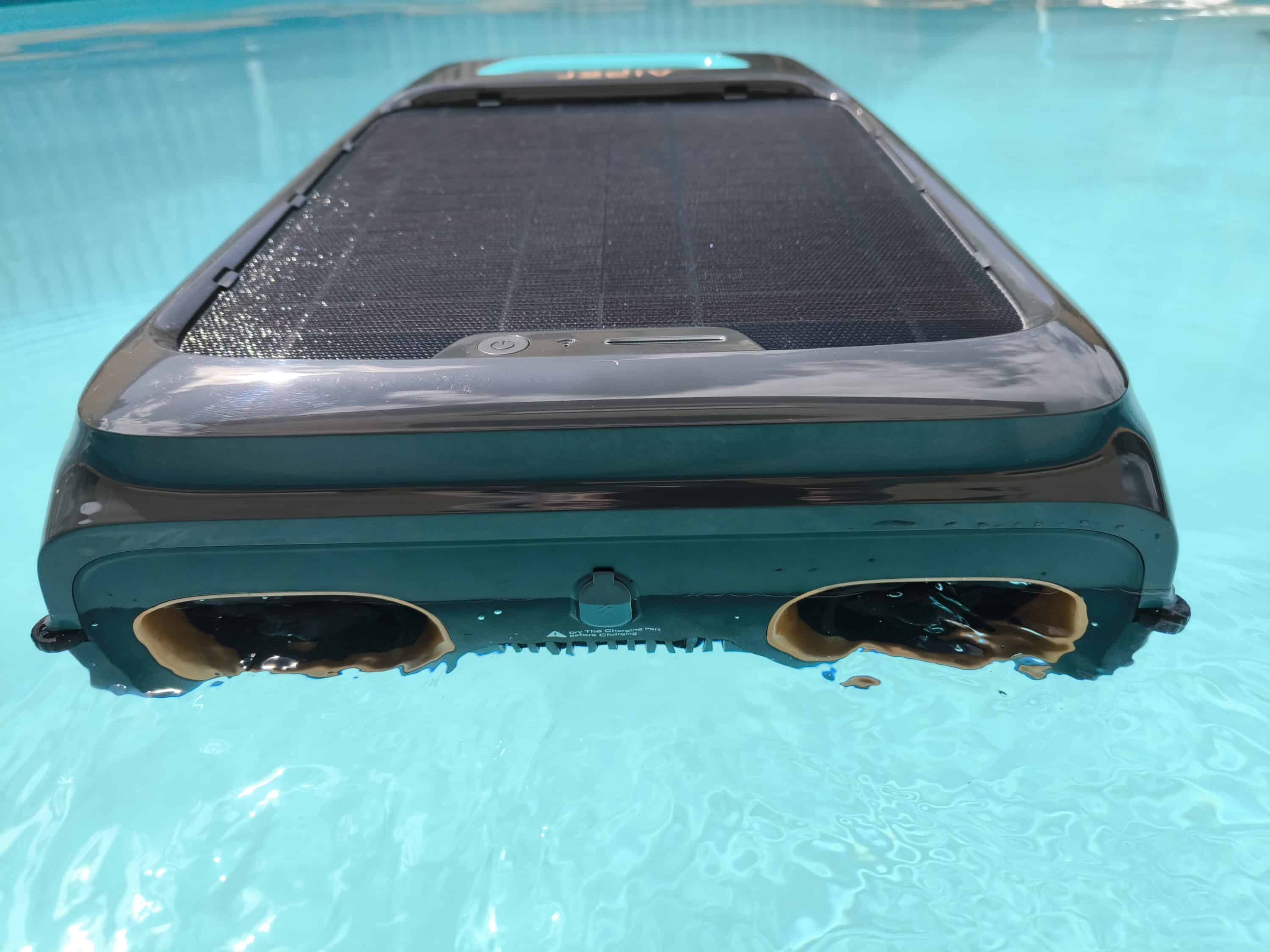 Kommen wir zu den harten Fakten des AIPER Surfer S2, mit anderen Worten: Was kann das Teil? Das großflächige Solarpanel ist unverändert geblieben, verfügt jedoch im Gegensatz zum Vorgängermodell nicht mehr über eine Aussparung in der Mitte. Beim Surfer S1 ließ sich schließlich das gesamte Deck nach hinten schieben, um zum Filterkorb zu gelangen. Dieses Feature ist beim neuen Modell nicht mehr vorhanden, da sich der Filterkorb nun von vorne entnehmen lässt. Weiterhin bleiben es grundsätzlich drei bürstenlose Motoren. Zwei davon dienen dem Antrieb der Propeller und einer dem Laufrad.