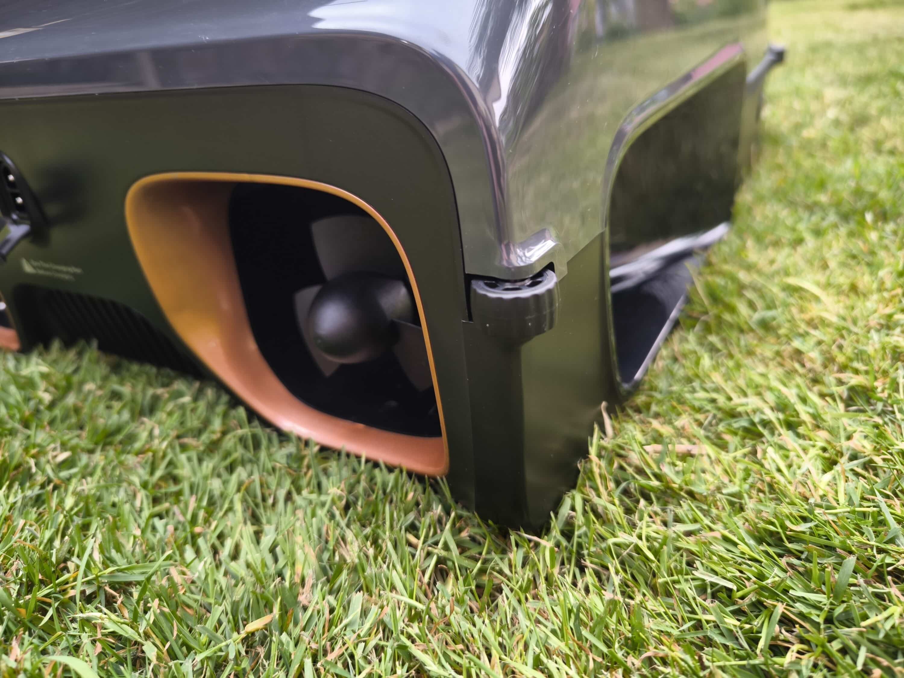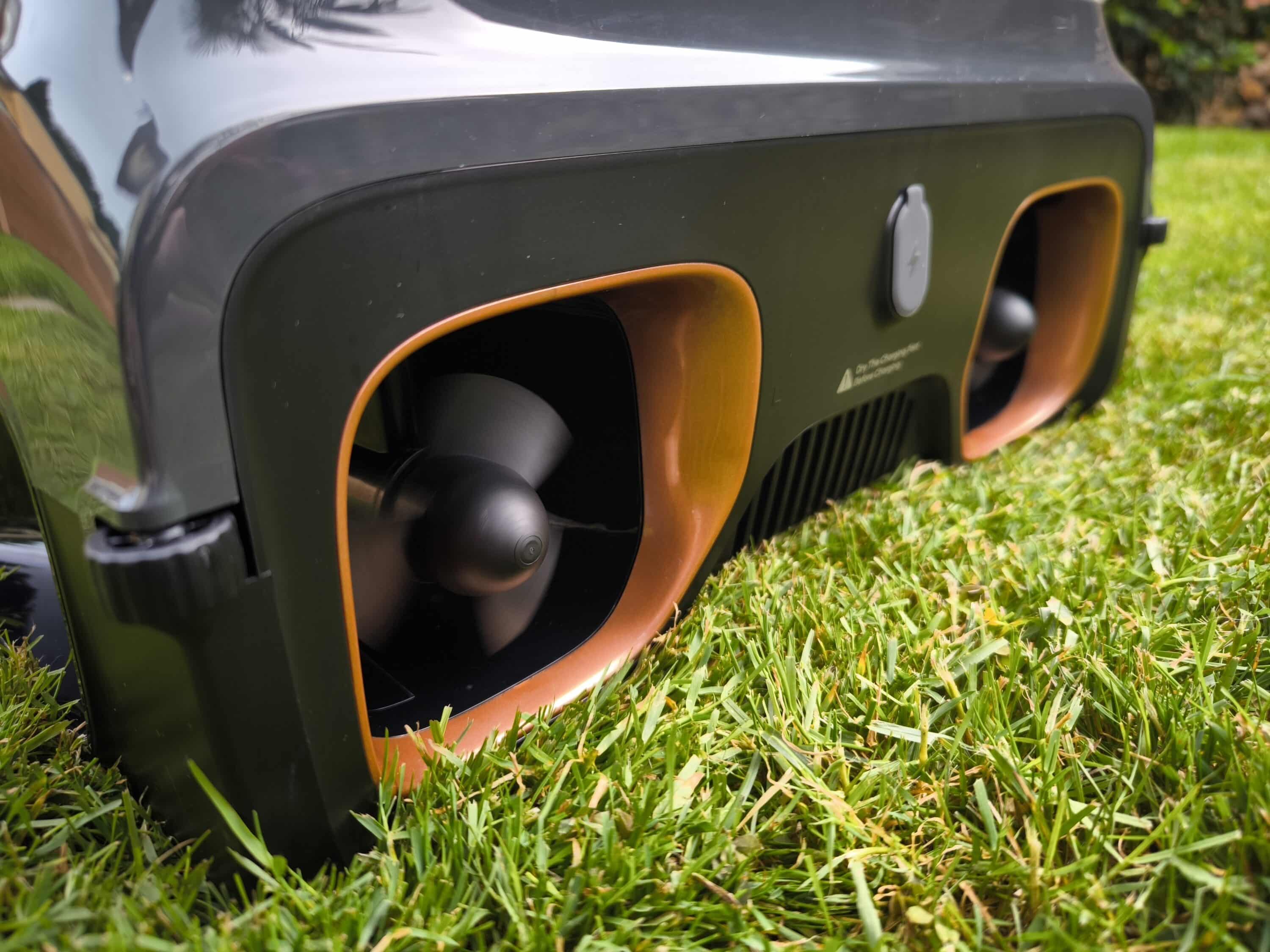 Abgesehen davon ist die Hauptfunktionalität des Poolroboters unverändert geblieben. Das großflächige Solarpanel sitzt nach wie vor auf der Geräteoberseite, auf der sich ebenfalls die Bedienelemente samt Tragegriff befinden. Auch die Ultraschallsensoren zur Hinderniserkennung auf dem Wasser bleiben gewohnt auf der Vorderseite. Auf der Rückseite sind neben dem Netzanschluss zudem die beiden schwarzen Propeller zu sehen, die außenrum mit einem bronzenen Akzent in Szene gesetzt werden. In derselben Farbe ist auch der Schriftzug von AIPER auf Höhe des Tragegriffs gehalten.
