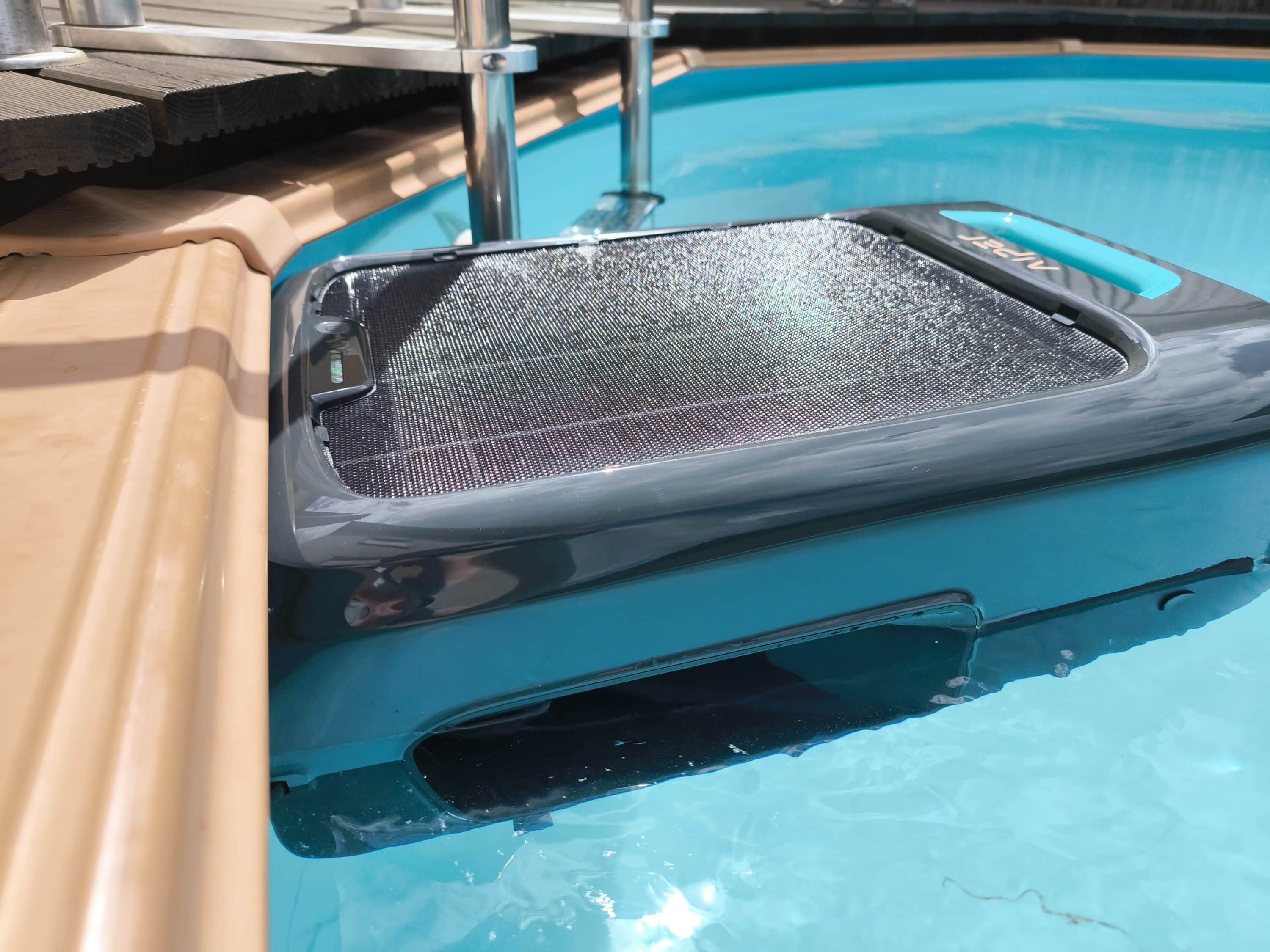 Beim ersten Auspacken und Verbinden mit der App wurde ein Akkustand von 59 % angezeigt. Da der AIPER Surfer S2 über zwei Lademöglichkeiten verfügt – einerseits das Laden per Solarstrom und andererseits die Gleichstromladung per Netzteil – ist man flexibel aufgestellt. Aktuell haben wir hier in Deutschland trotz des Endes des Wonnemonats noch etwas gemischtes Wetter. Wir haben uns jedoch für die Nutzung von Solarstrom entschieden. Somit wurde der Surfer S2 in den Pool geschickt und mit nur einem Tastendruck auf den Power-Schalter in Betrieb genommen.