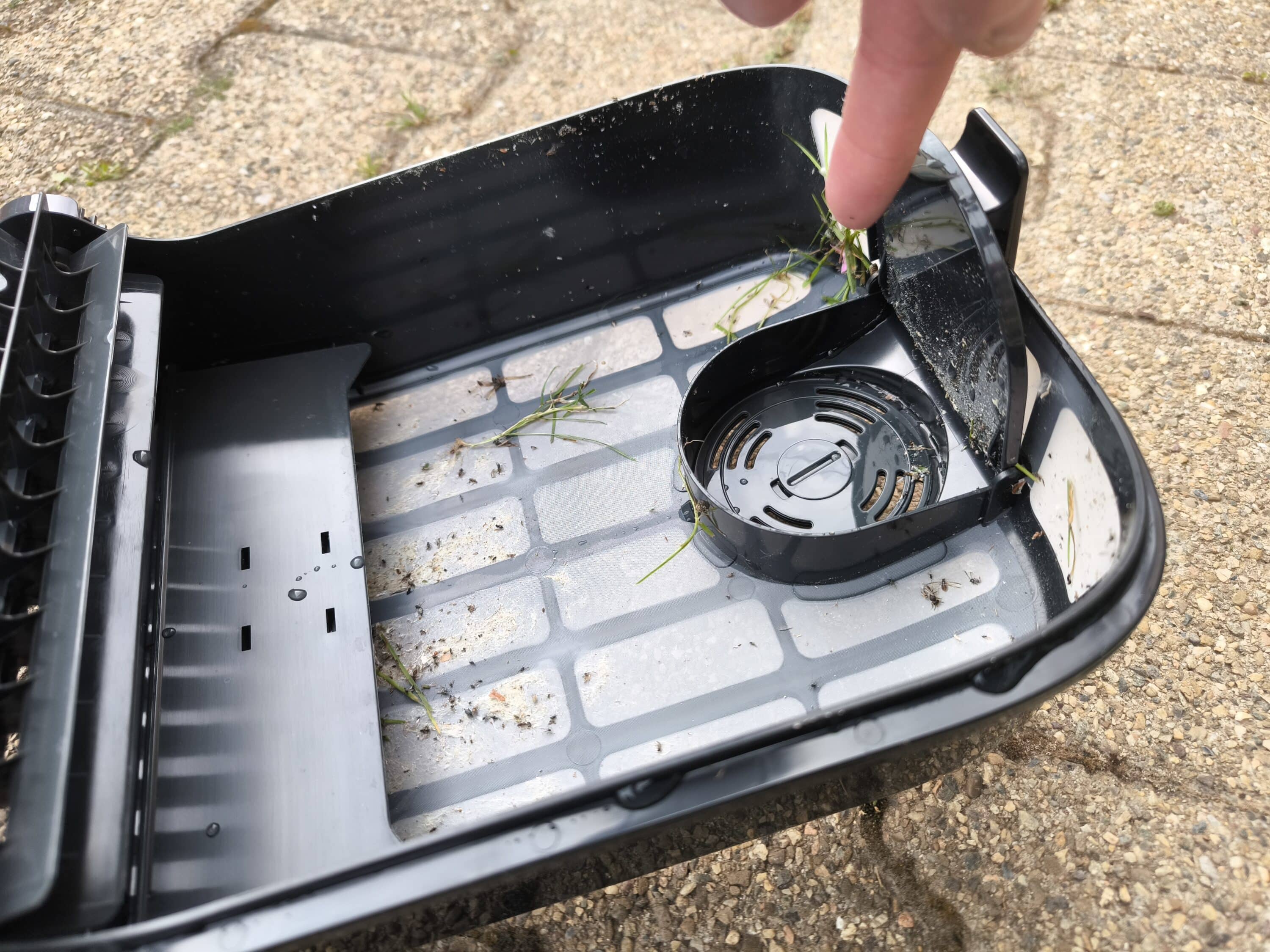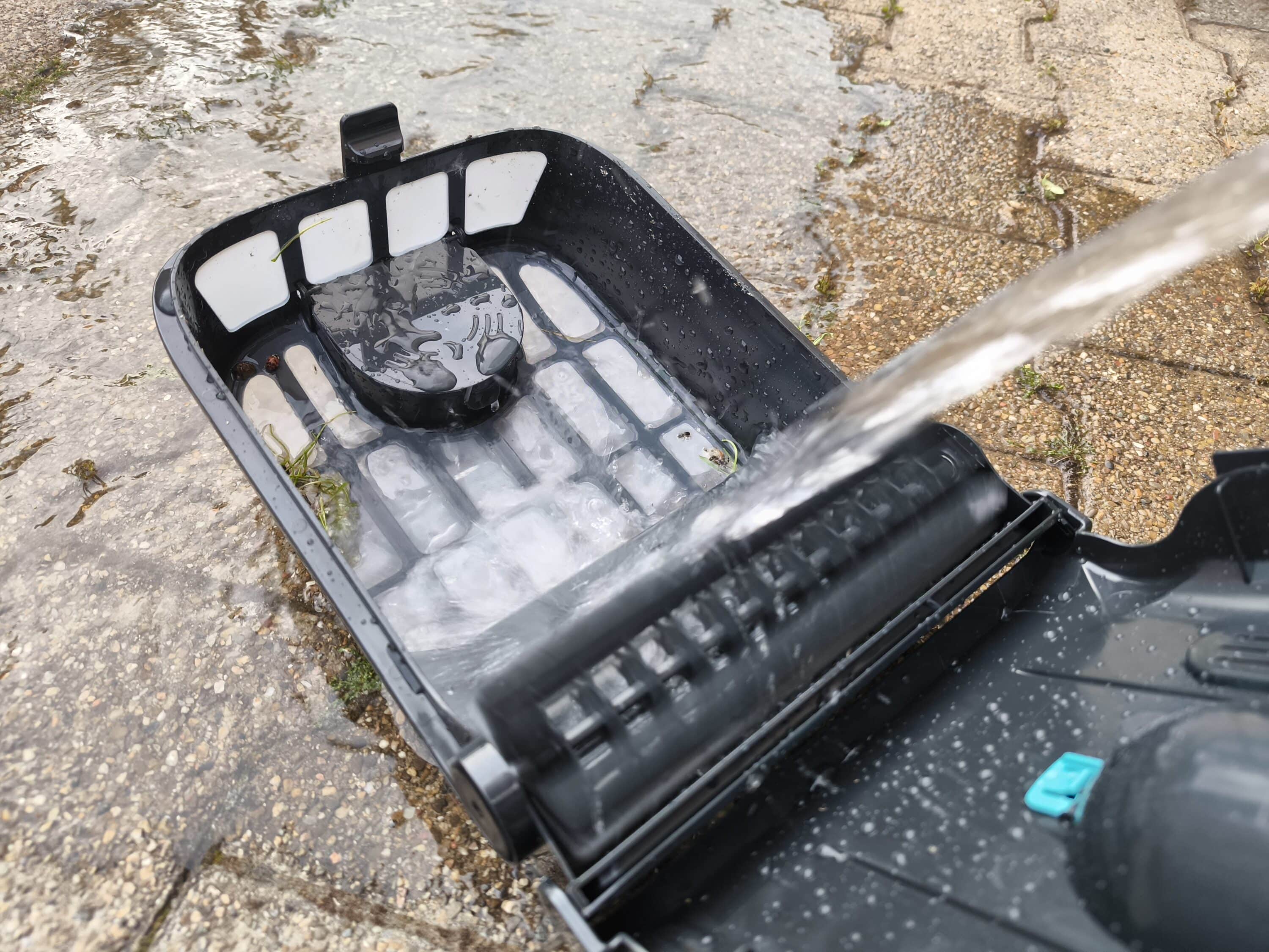 Zunächst wird der Filterkorb mit dem Gartenschlauch vollständig ausgespült. Bei Bedarf kann man anschließend eine Chlortablette in das entsprechende Fach legen und den Filterkorb wieder schließen. Zum Schluss den Filterkorb also wieder ins Gehäuse einschieben – fertig ist der Reinigungsprozess. Der Spülvorgang ist also nach wie vor einfach und ohne größere Hürden. Obwohl die Filtergröße beim neuen Modell von 5 auf 4 Liter reduziert wurde, dürfte sich dies in der Praxis kaum bemerkbar machen.