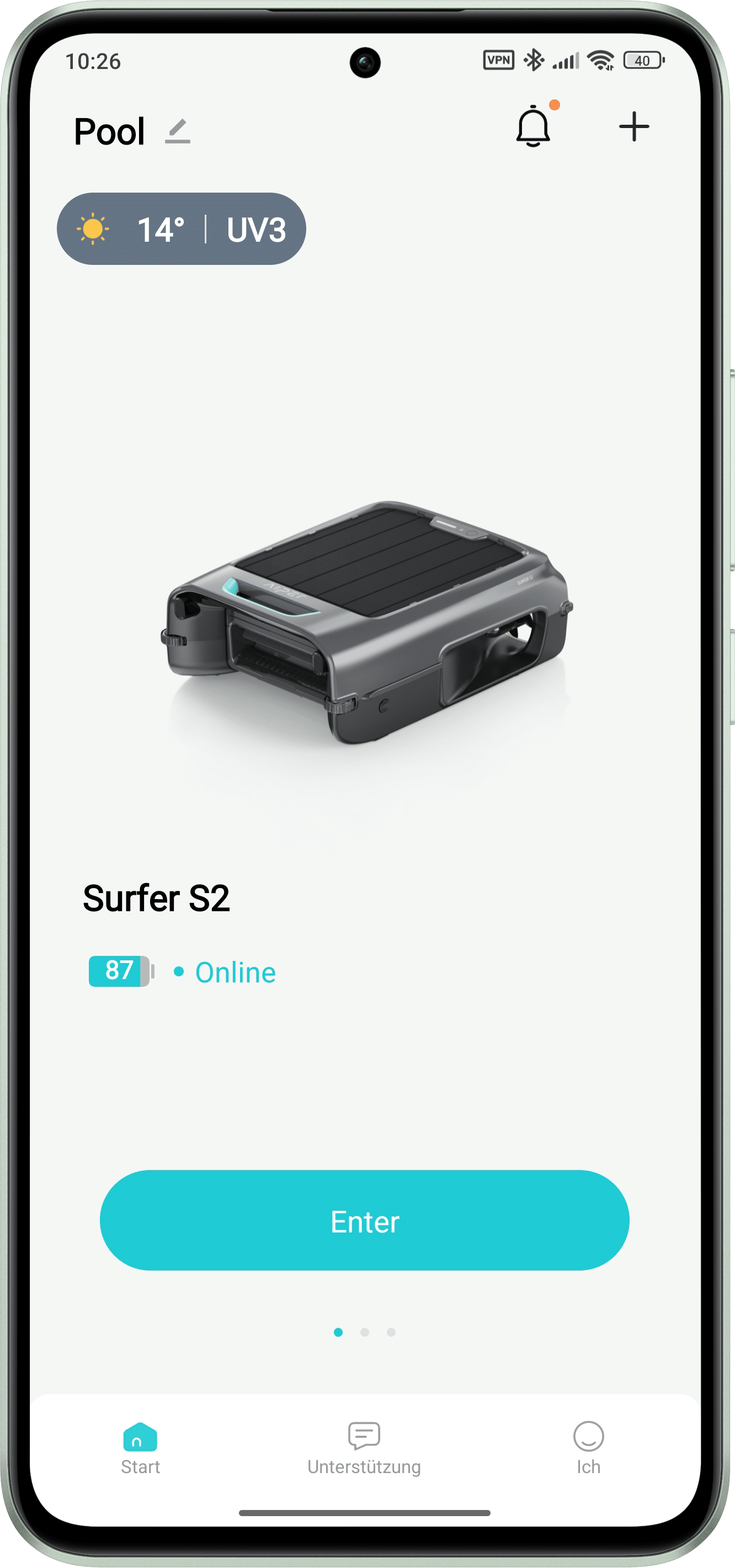 Wie beim Vorgängermodell gibt es auch beim AIPER Surfer S2 eine Smartphone-App, mit der sich der Poolroboter smart steuern lässt. Verfügbar ist die App sowohl für Android wie auch für IOS. Nach der Einrichtung des Accounts beim Hersteller und dem Koppeln des Poolroboters per QR-Code oder Bluetooth steht einer sofortigen Nutzung nichts im Wege.